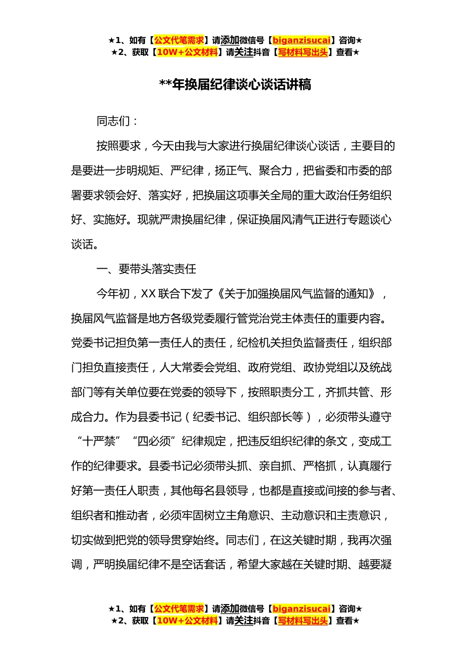 ★1、如有【公文代笔需求】请添加微信号【biganzisucai】咨询★★2、获取【10W+公文材料】请关注抖音【写材料写出头】查看★**年换届纪律谈心谈话讲稿同志们:按照要求,今天由我与大家进行换届纪律谈心谈话,主要目的是要进一步明规矩、严纪律,扬正气、聚合力,把省委和市委的部署要求领会好、落实好,把换届这项事关全局的重大政治任务组织好、实施好。现就严肃换届纪律,保证换届风清气正进行专题谈心谈话。一、要带头落实责任今年初,XX联合下发了《关于加强换届风气监督的通知》,换届风气监督是地方各级党委履行管党治党主体责任的重要内容。党委书记担负第一责任人的责任,纪检机关担负监督责任,组织部门担负直接责任,人大常委会党组、政府党组、政协党组以及统战部门等有关单位要在党委的领导下,按照...