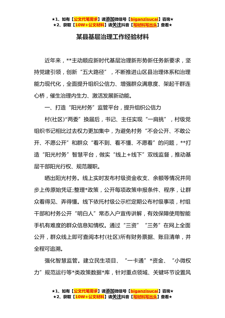 ★1、如有【公文代笔需求】请添加微信号【biganzisucai】咨询★★2、获取【10W+公文材料】请关注抖音【写材料写出头】查看★某县基层治理工作经验材料近年来,**主动顺应新时代基层治理新形势新任务新要求,坚持党建引领,创新“五大路径”,不断推进山区县治理体系和治理能力现代化,全面提升组织公信力、增强群众满意度、架起干群连心桥,催生治理内生力、激活发展新动能。一、打造“阳光村务”监管平台,提升组织公信力村(社区)“两委”换届后,书记、主任实现“一肩挑”,村级党组织书记相比过去权力更加集中,为避免村务“不会公开、不敢公开、不愿公开”和群众“看不到、看不懂、不愿看”的问题,**打造“阳光村务”智慧平台,做实“线上+线下”双线监督,推动基层干部阳光行权、规范履职。晒出阳光村务。线...