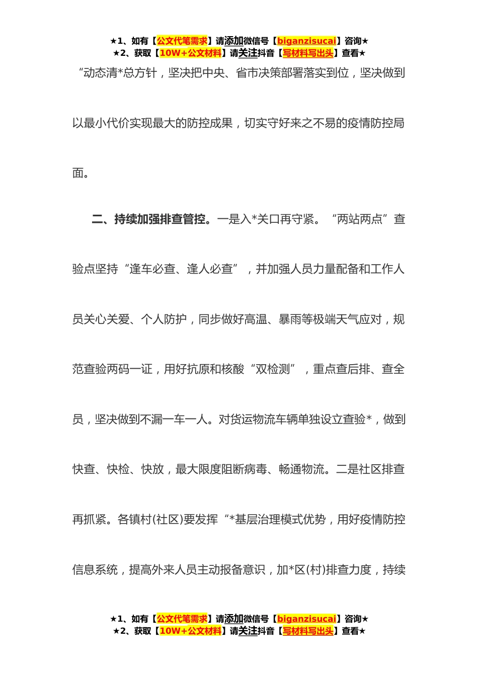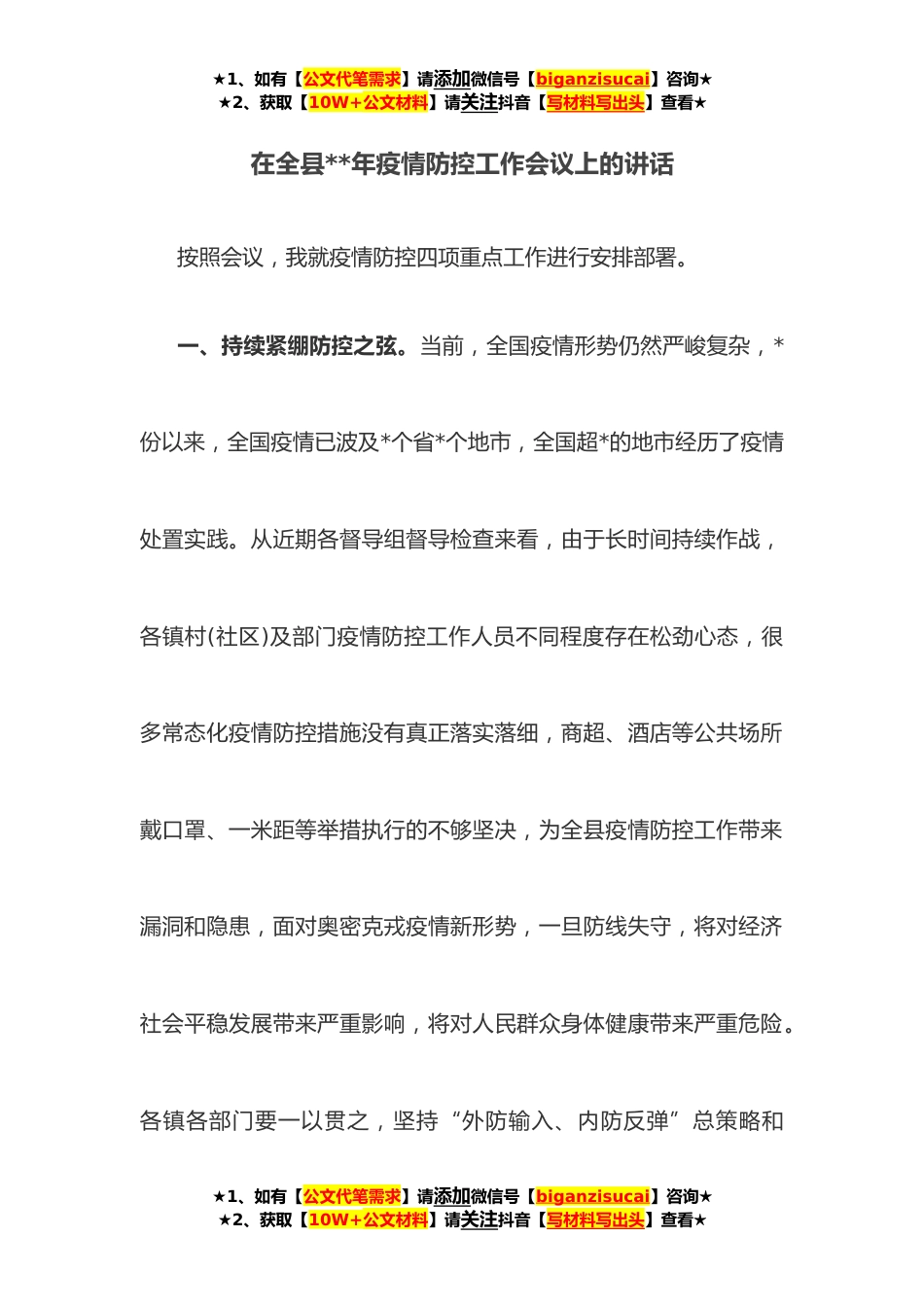 ★1、如有【公文代笔需求】请添加微信号【biganzisucai】咨询★★2、获取【10W+公文材料】请关注抖音【写材料写出头】查看★在全县**年疫情防控工作会议上的讲话按照会议,我就疫情防控四项重点工作进行安排部署。一、持续紧绷防控之弦。当前,全国疫情形势仍然严峻复杂,*份以来,全国疫情已波及*个省*个地市,全国超*的地市经历了疫情处置实践。从近期各督导组督导检查来看,由于长时间持续作战,各镇村(社区)及部门疫情防控工作人员不同程度存在松劲心态,很多常态化疫情防控措施没有真正落实落细,商超、酒店等公共场所戴口罩、一米距等举措执行的不够坚决,为全县疫情防控工作带来漏洞和隐患,面对奥密克戎疫情新形势,一旦防线失守,将对经济社会平稳发展带来严重影响,将对人民群众身体健康带来严重危险。...