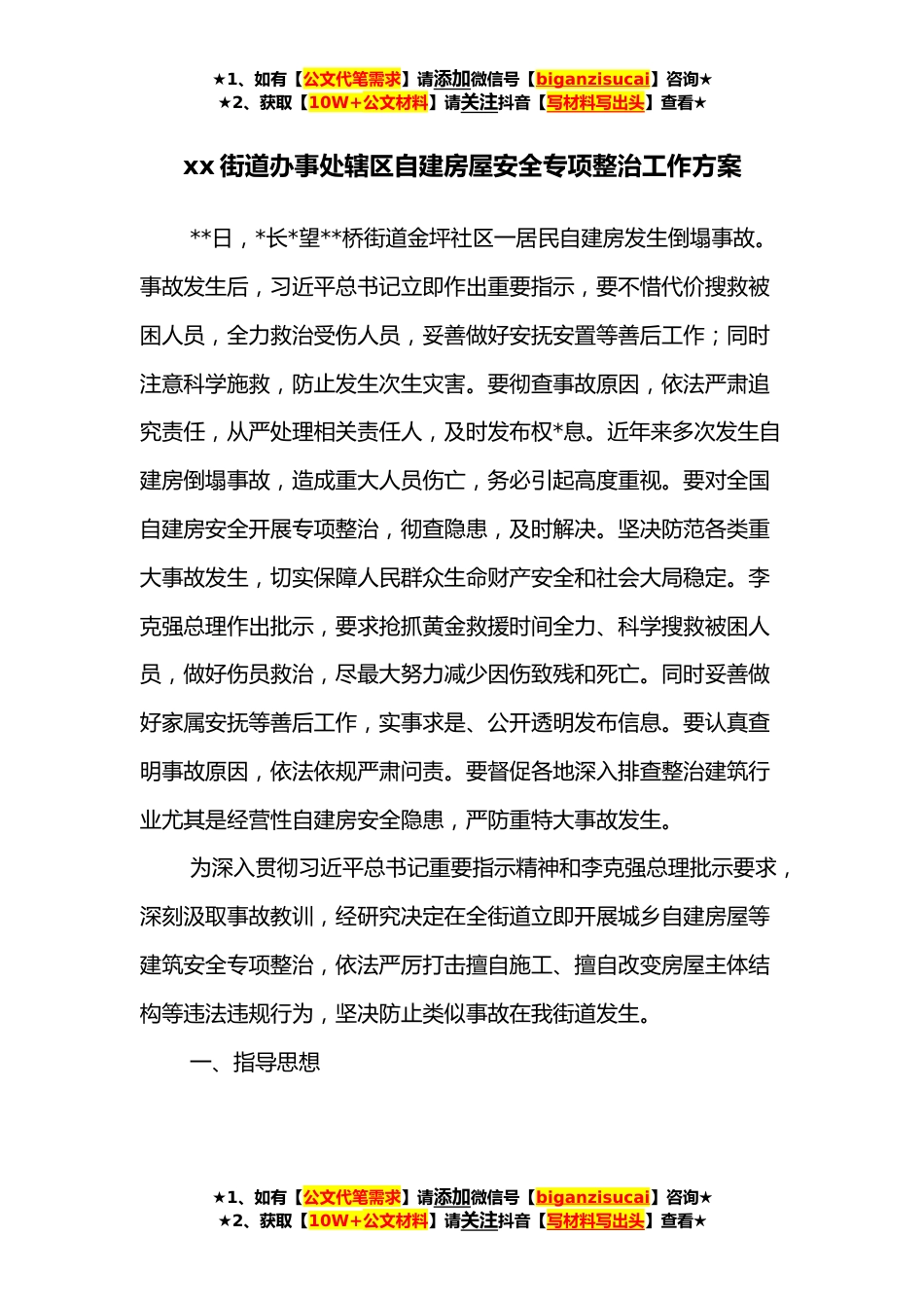 ★1、如有【公文代笔需求】请添加微信号【biganzisucai】咨询★★2、获取【10W+公文材料】请关注抖音【写材料写出头】查看★xx街道办事处辖区自建房屋安全专项整治工作方案**日,*长*望**桥街道金坪社区一居民自建房发生倒塌事故。事故发生后,习近平总书记立即作出重要指示,要不惜代价搜救被困人员,全力救治受伤人员,妥善做好安抚安置等善后工作;同时注意科学施救,防止发生次生灾害。要彻查事故原因,依法严肃追究责任,从严处理相关责任人,及时发布权*息。近年来多次发生自建房倒塌事故,造成重大人员伤亡,务必引起高度重视。要对全国自建房安全开展专项整治,彻查隐患,及时解决。坚决防范各类重大事故发生,切实保障人民群众生命财产安全和社会大局稳定。李克强总理作出批示,要求抢抓黄金救援时间全力...