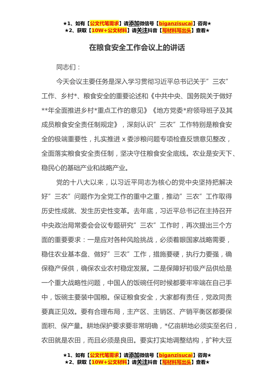 ★1、如有【公文代笔需求】请添加微信号【biganzisucai】咨询★★2、获取【10W+公文材料】请关注抖音【写材料写出头】查看★在粮食安全工作会议上的讲话同志们:今天会议主要任务是深入学习贯彻习近平总书记关于”三农”工作、乡村*、粮食安全的重要论述和《中共中央、国务院关于做好**年全面推进乡村*重点工作的意见》《地方党委*府领导班子及其成员粮食安全责任制规定》,深刻认识”三农”工作特别是粮食安全的极端重要性,扎实推进x委涉粮问题专项检查反馈意见整改,全面落实粮食安全责任制,坚决守住粮食安全底线。农业是安天下、稳民心的基础产业和战略产业。党的十八大以来,以习近平同志为核心的党中央坚持把解决好”三农”问题作为全党工作的重中之重,推动”三农”工作取得历史性成就、发生历史性变革。...