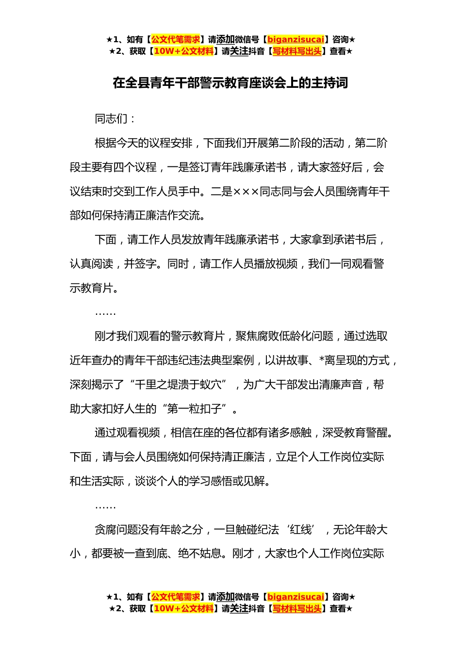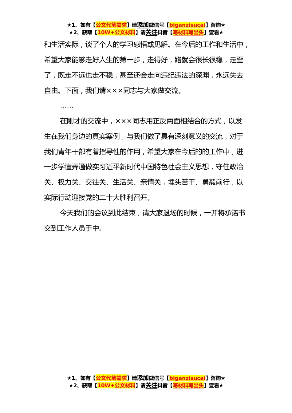 ★1、如有【公文代笔需求】请添加微信号【biganzisucai】咨询★★2、获取【10W+公文材料】请关注抖音【写材料写出头】查看★在全县青年干部警示教育座谈会上的主持词同志们:根据今天的议程安排,下面我们开展第二阶段的活动,第二阶段主要有四个议程,一是签订青年践廉承诺书,请大家签好后,会议结束时交到工作人员手中。二是×××同志同与会人员围绕青年干部如何保持清正廉洁作交流。下面,请工作人员发放青年践廉承诺书,大家拿到承诺书后,认真阅读,并签字。同时,请工作人员播放视频,我们一同观看警示教育片。……刚才我们观看的警示教育片,聚焦腐败低龄化问题,通过选取近年查办的青年干部违纪违法典型案例,以讲故事、*离呈现的方式,深刻揭示了“千里之堤溃于蚁穴”,为广大干部发出清廉声音,帮助大...