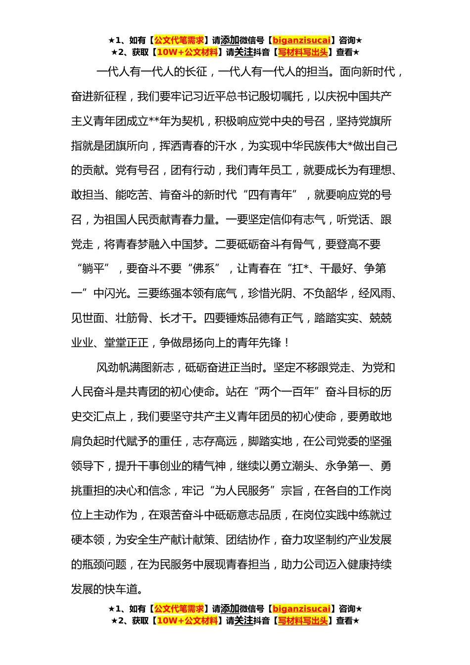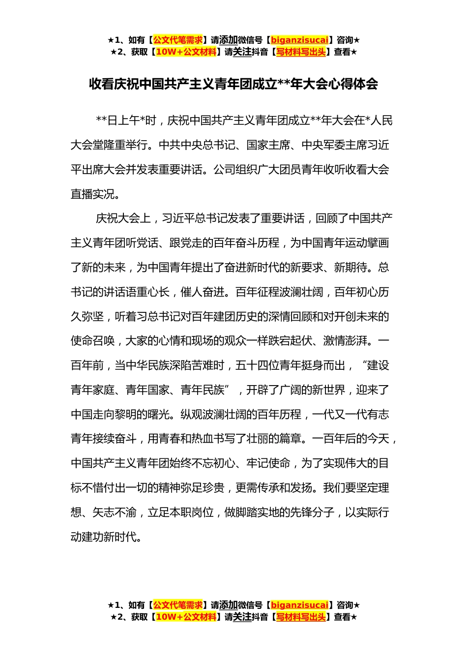 ★1、如有【公文代笔需求】请添加微信号【biganzisucai】咨询★★2、获取【10W+公文材料】请关注抖音【写材料写出头】查看★收看庆祝中国共产主义青年团成立**年大会心得体会**日上午*时,庆祝中国共产主义青年团成立**年大会在*人民大会堂隆重举行。中共中央总书记、国家主席、中央军委主席习近平出席大会并发表重要讲话。公司组织广大团员青年收听收看大会直播实况。庆祝大会上,习近平总书记发表了重要讲话,回顾了中国共产主义青年团听党话、跟党走的百年奋斗历程,为中国青年运动擘画了新的未来,为中国青年提出了奋进新时代的新要求、新期待。总书记的讲话语重心长,催人奋进。百年征程波澜壮阔,百年初心历久弥坚,听着习总书记对百年建团历史的深情回顾和对开创未来的使命召唤,大家的心情和现场的观众一...