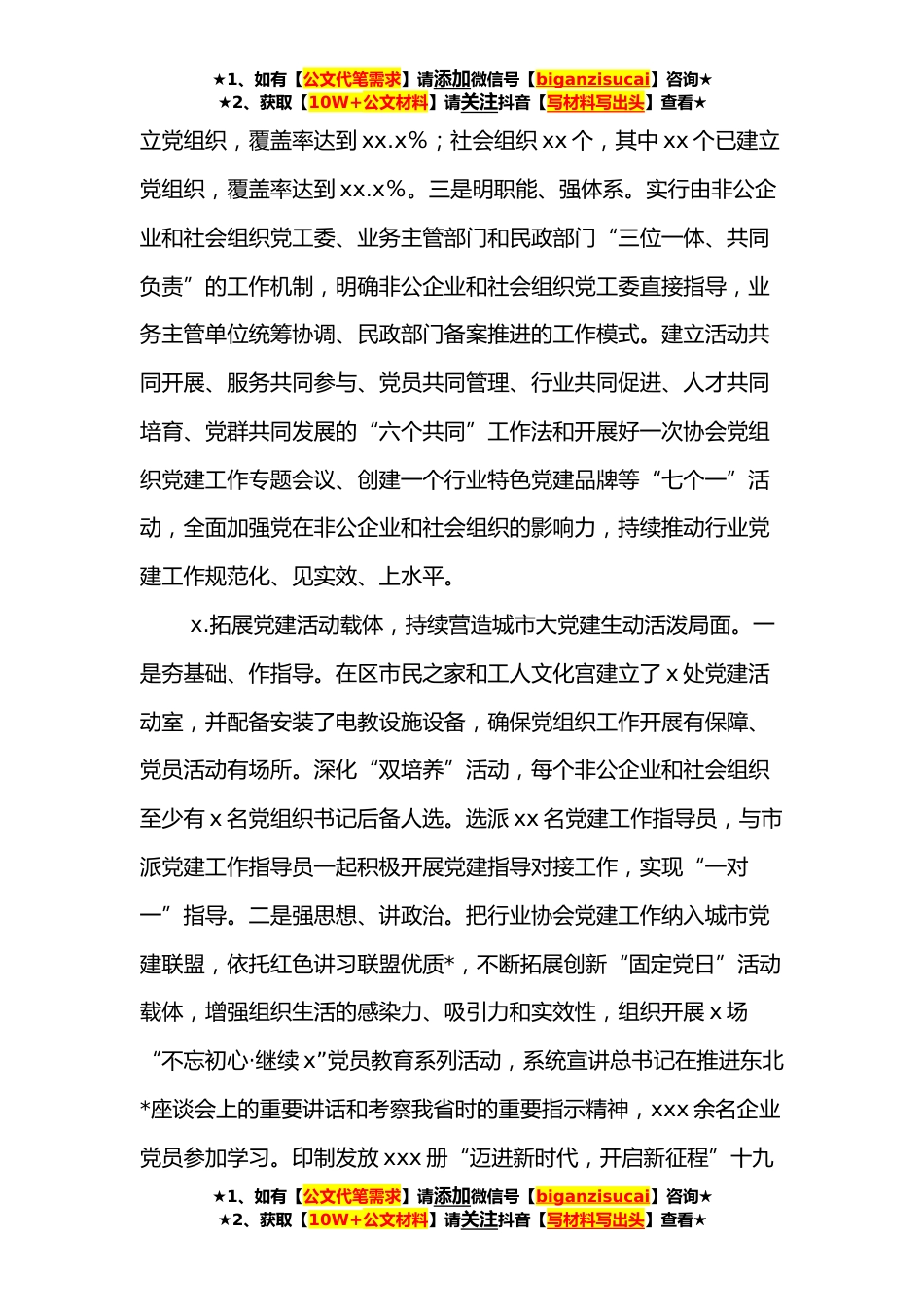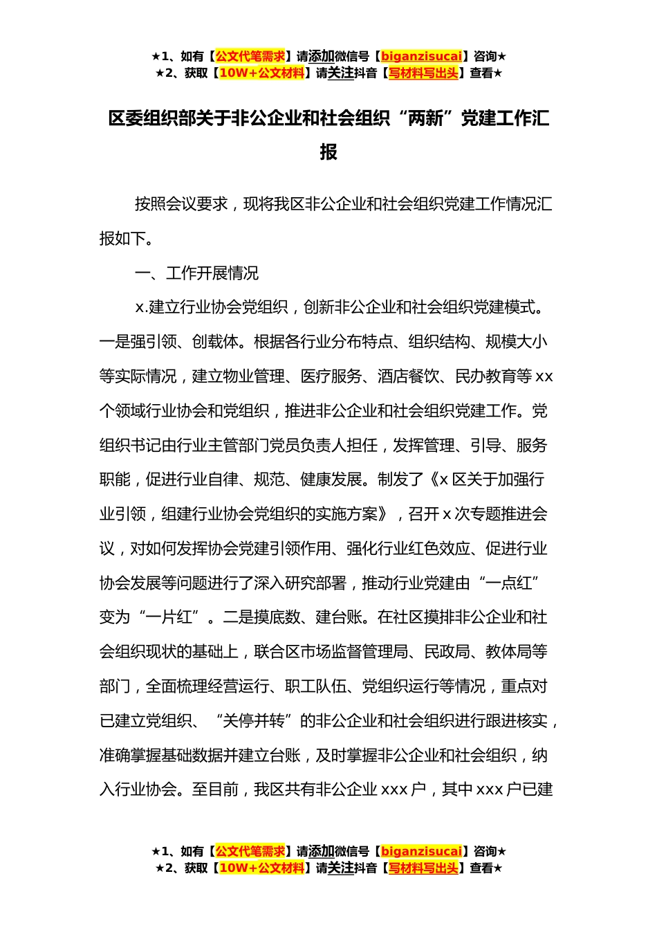★1、如有【公文代笔需求】请添加微信号【biganzisucai】咨询★★2、获取【10W+公文材料】请关注抖音【写材料写出头】查看★区委组织部关于非公企业和社会组织“两新”党建工作汇报按照会议要求,现将我区非公企业和社会组织党建工作情况汇报如下。一、工作开展情况x.建立行业协会党组织,创新非公企业和社会组织党建模式。一是强引领、创载体。根据各行业分布特点、组织结构、规模大小等实际情况,建立物业管理、医疗服务、酒店餐饮、民办教育等xx个领域行业协会和党组织,推进非公企业和社会组织党建工作。党组织书记由行业主管部门党员负责人担任,发挥管理、引导、服务职能,促进行业自律、规范、健康发展。制发了《x区关于加强行业引领,组建行业协会党组织的实施方案》,召开x次专题推进会议,对如何发挥协...