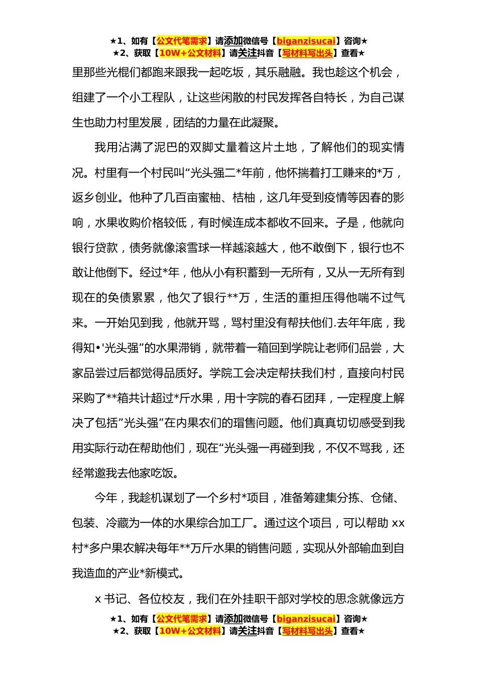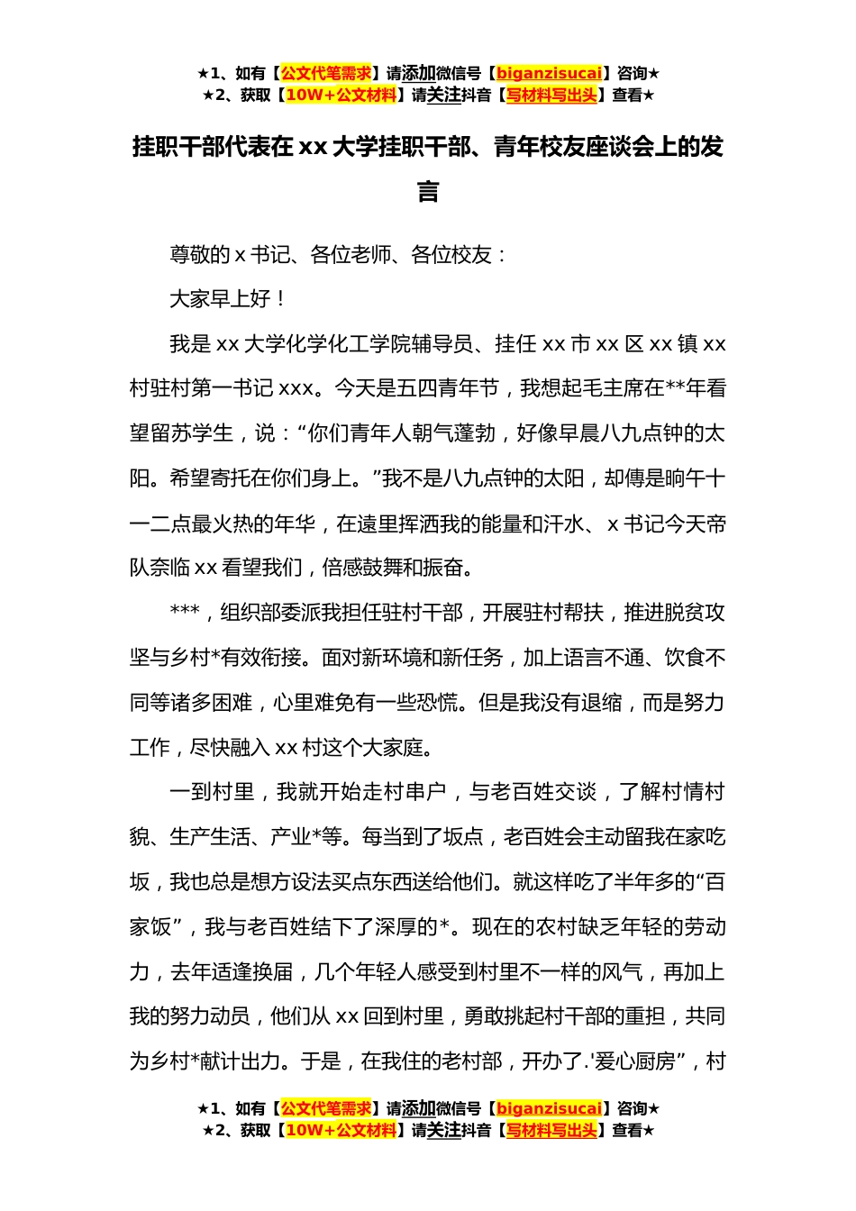 ★1、如有【公文代笔需求】请添加微信号【biganzisucai】咨询★★2、获取【10W+公文材料】请关注抖音【写材料写出头】查看★挂职干部代表在xx大学挂职干部、青年校友座谈会上的发言尊敬的x书记、各位老师、各位校友:大家早上好!我是xx大学化学化工学院辅导员、挂任xx市xx区xx镇xx村驻村第一书记xxx。今天是五四青年节,我想起毛主席在**年看“望留苏学生,说:你们青年人朝气蓬勃,好像早晨八九点钟的太”阳。希望寄托在你们身上。我不是八九点钟的太阳,却傳是晌午十一二点最火热的年华,在遠里挥洒我的能量和汗水、x书记今天帝队奈临xx看望我们,倍感鼓舞和振奋。***,组织部委派我担任驻村干部,开展驻村帮扶,推进脱贫攻坚与乡村*有效衔接。面对新环境和新任务,加上语言不通、饮食不同等诸多困难,心里难免...