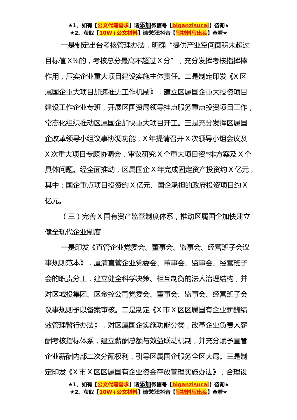 ★1、如有【公文代笔需求】请添加微信号【biganzisucai】咨询★★2、获取【10W+公文材料】请关注抖音【写材料写出头】查看★区国资局X年工作总结X年,在区委区政府的坚强领导下,我局始终坚持以习近平新时代中国特色社会主义思想为指导,全面贯彻党的十九大和十九届二中、三中、四中、五中全会精神,深入学习贯彻习近平总书记出席X经济特区建立X周年庆祝大会和视察*、X重要讲话、重要指示精神,紧紧围绕区委区政府工作部署,抢抓机遇、开拓进取、攻坚克难,全力推动国资、集资业务全面发展,为X勇当X建设中国特色社会主义先行示范区的排头兵,打造现代化国际化创新型的高水平X东部中心提供有力保证。一、X年工作总结(一)主动落实抗疫期间租金减免,助推企业复工复产一是充分发挥区属国企保市场主体的带头示范作...