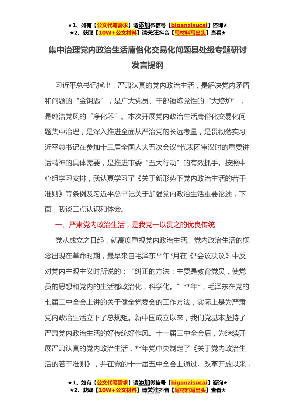 ★1、如有【公文代笔需求】请添加微信号【biganzisucai】咨询★★2、获取【10W+公文材料】请关注抖音【写材料写出头】查看★集中治理党内政治生活庸俗化交易化问题县处级专题研讨发言提纲习近平总书记指出,严肃认真的党内政治生活,是解决党内矛盾和问题的“金钥匙”,是广大党员、干部锤炼党性的“大熔炉”,是纯洁党风的“净化器”。本次开展党内政治生活庸俗化交易化问题集中治理,是深入推进全面从严治党的长远考量,是贯彻落实习近平总书记在参加十三届全国人大五次会议*代表团审议时的重要讲话精神的具体需要,是推进市委“五大行动”的有效抓手。按照中心组学习安排,我认真学习了《关于新形势下党内政治生活的若干准则》等条例及习近平总书记关于加强党内政治生活重要论述,下面,我谈三点认识和体会。一...