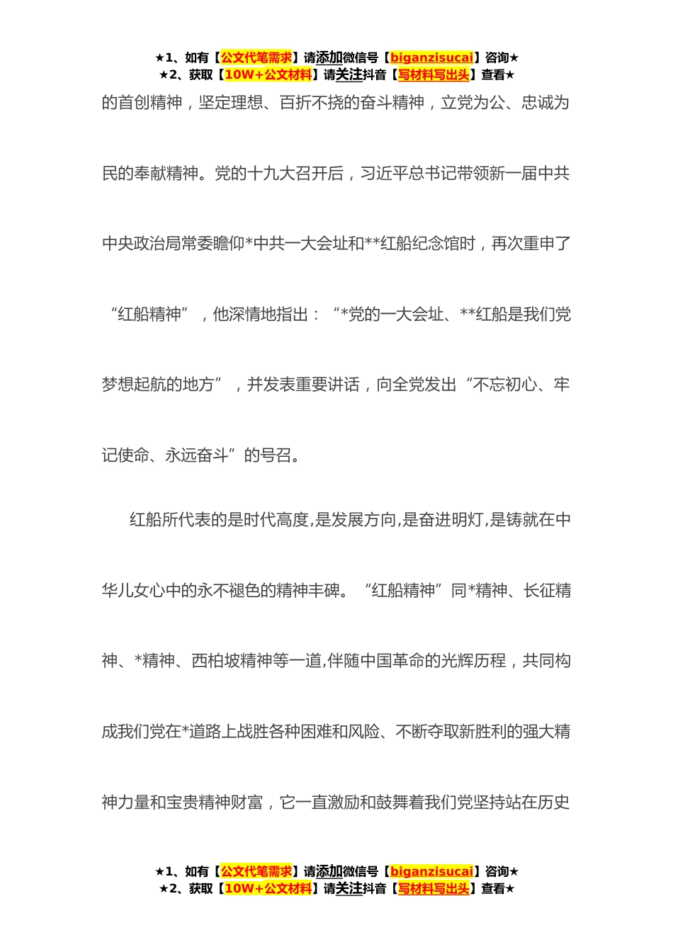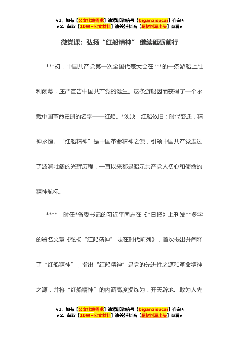 ★1、如有【公文代笔需求】请添加微信号【biganzisucai】咨询★★2、获取【10W+公文材料】请关注抖音【写材料写出头】查看★微党课:弘扬“红船精神”继续砥砺前行***初,中国共产党第一次全国代表大会在***的一条游船上胜利闭幕,庄严宣告中国共产党的诞生。这条游船因而获得了一个永载中国革命史册的名字——红船。*泱泱,红船依旧;时代变迁,精神永恒。“红船精神”是中国革命精神之源,引领中国共产党走过了波澜壮阔的光辉历程,一直以来都是昭示共产党人初心和使命的精神航标。****,时任*省委书记的习近平同志在《*日报》上刊发**多字的署名文章《弘扬“红船精神”走在时代前列》,首次提出并阐释了“红船精神”,指出“红船精神”是党的先进性之源和革命精神之源,并将“红船精神”的内涵高度提炼为:开天...