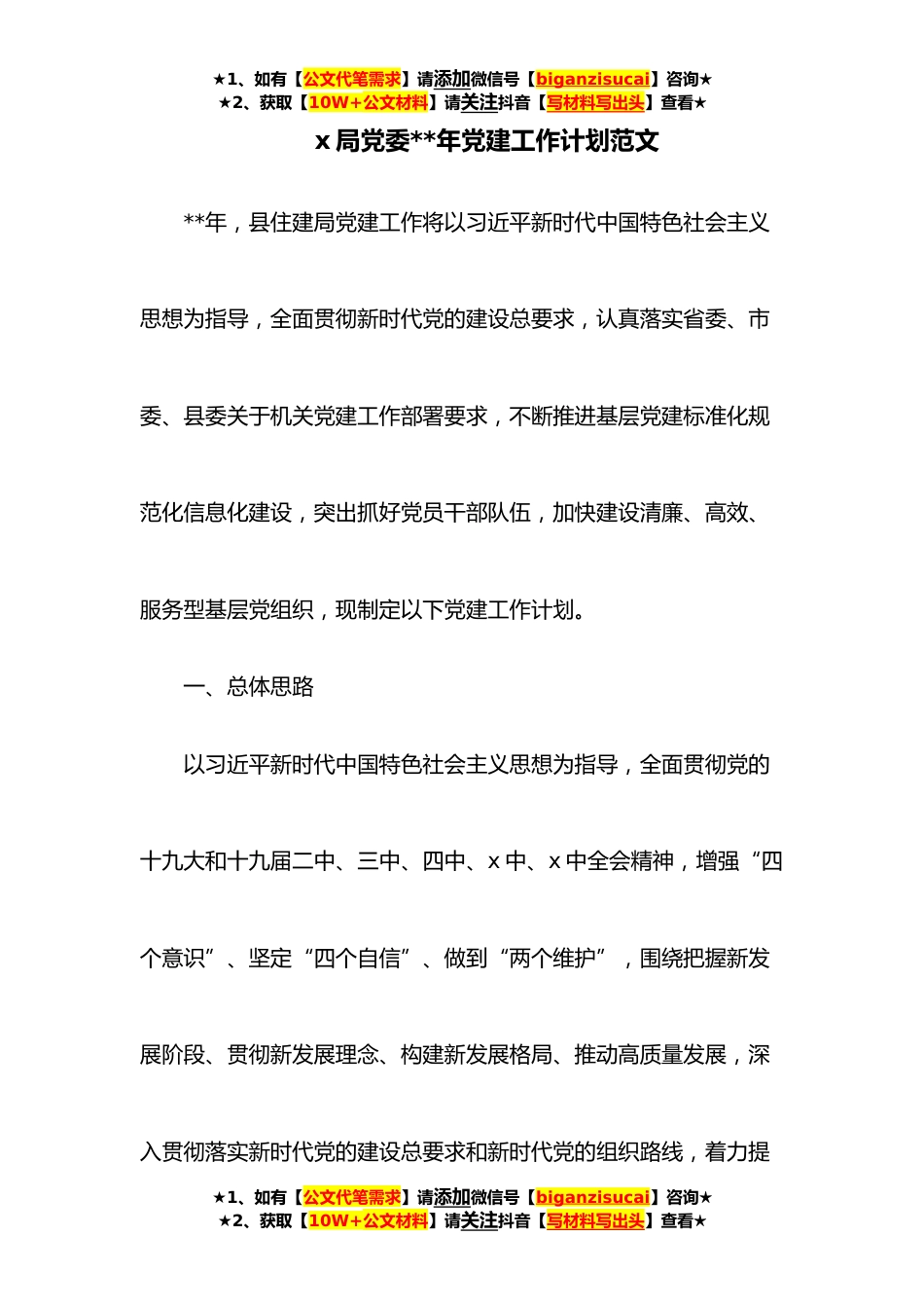 ★1、如有【公文代笔需求】请添加微信号【biganzisucai】咨询★★2、获取【10W+公文材料】请关注抖音【写材料写出头】查看★x局党委**年党建工作计划范文**年,县住建局党建工作将以习近平新时代中国特色社会主义思想为指导,全面贯彻新时代党的建设总要求,认真落实省委、市委、县委关于机关党建工作部署要求,不断推进基层党建标准化规范化信息化建设,突出抓好党员干部队伍,加快建设清廉、高效、服务型基层党组织,现制定以下党建工作计划。一、总体思路以习近平新时代中国特色社会主义思想为指导,全面贯彻党的十九大和十九届二中、三中、四中、x中、x中全会精神,增强“四个意识”、坚定“四个自信”、做到“两个维护”,围绕把握新发展阶段、贯彻新发展理念、构建新发展格局、推动高质量发展,深入贯彻落实...