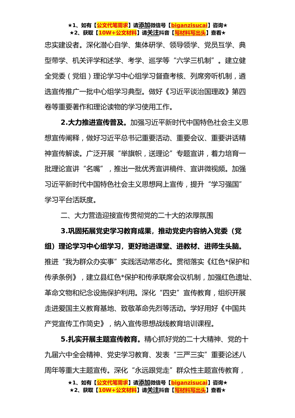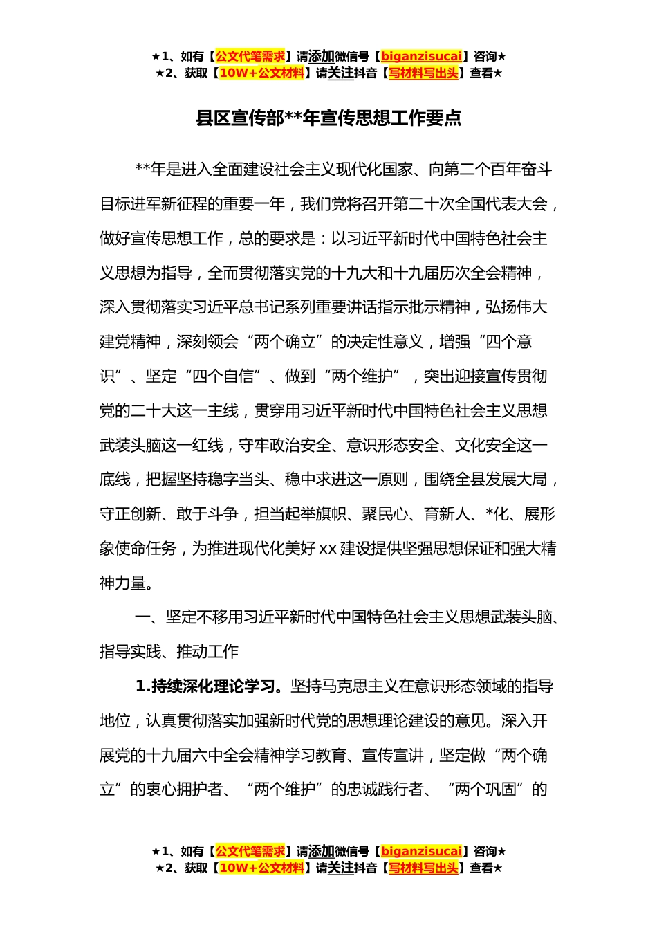 ★1、如有【公文代笔需求】请添加微信号【biganzisucai】咨询★★2、获取【10W+公文材料】请关注抖音【写材料写出头】查看★县区宣传部**年宣传思想工作要点**年是进入全面建设社会主义现代化国家、向第二个百年奋斗目标进军新征程的重要一年,我们党将召开第二十次全国代表大会,做好宣传思想工作,总的要求是:以习近平新时代中国特色社会主义思想为指导,全而贯彻落实党的十九大和十九届历次全会精神,深入贯彻落实习近平总书记系列重要讲话指示批示精神,弘扬伟大建党精神,深刻领会“两个确立”的决定性意义,增强“四个意识”、坚定“四个自信”、做到“两个维护”,突出迎接宣传贯彻党的二十大这一主线,贯穿用习近平新时代中国特色社会主义思想武装头脑这一红线,守牢政治安全、意识形态安全、文化安全这...