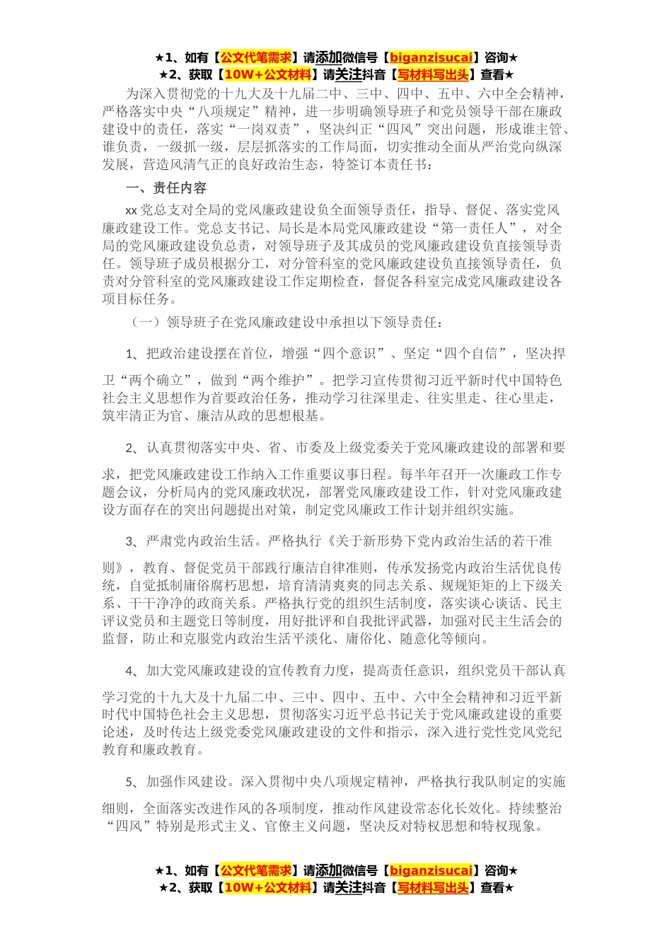 ★1、如有【公文代笔需求】请添加微信号【biganzisucai】咨询★★2、获取【10W+公文材料】请关注抖音【写材料写出头】查看★为深入贯彻党的十九大及十九届二中、三中、四中、五中、六中全会精神,严格落实中央“八项规定”精神,进一步明确领导班子和党员领导干部在廉政建设中的责任,落实“一岗双责”,坚决纠正“四风”突出问题,形成谁主管、谁负责,一级抓一级,层层抓落实的工作局面,切实推动全面从严治党向纵深发展,营造风清气正的良好政治生态,特签订本责任书:一、责任内容xx党总支对全局的党风廉政建设负全面领导责任,指导、督促、落实党风廉政建设工作。党总支书记、局长是本局党风廉政建设“第一责任人”,对全局的党风廉政建设负总责,对领导班子及其成员的党风廉政建设负直接领导责任。领导班子...