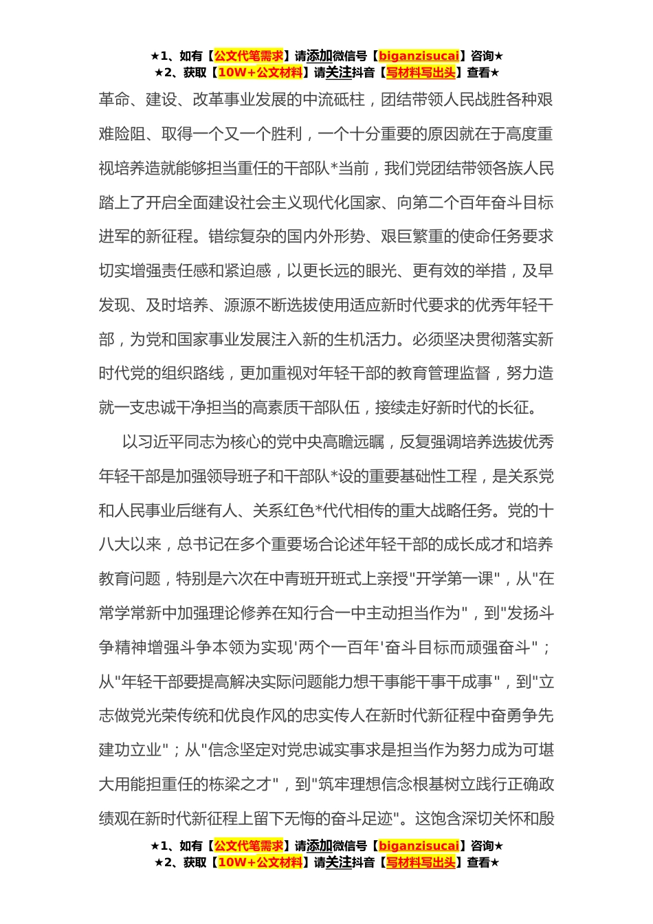 ★1、如有【公文代笔需求】请添加微信号【biganzisucai】咨询★★2、获取【10W+公文材料】请关注抖音【写材料写出头】查看★加强年轻干部教育管理监督的几点体会同志们:习近平总书记历来高度重视对年轻干部的培养,围绕造就新时代的栋梁之才发表一系列重要论述,亲自为年轻干部拟定全面系统的"成长手册"和"行动指南"。在今年初召开的中央纪委六次全会上,习近平总书记鲜明提出要从严从实加强教育管理监督,引导年轻干部对党忠诚老实,坚定理想信念,牢记初心使命,正确对待权力,时刻自重自省,严守纪法规矩,扣好廉洁从政的"第一粒扣子"。语重心长的重要讲话,不仅具有很强的现实针对性,而且饱含深远的历史考量。机关党支部大多是年轻同志,要牢记习近平总书记的嘱托,扣好人生"第一粒扣子"。结合今天的支部党...
