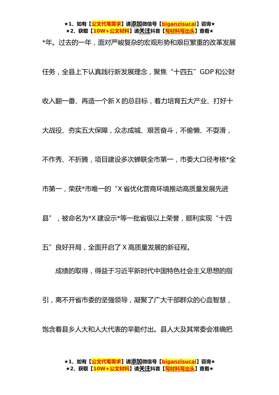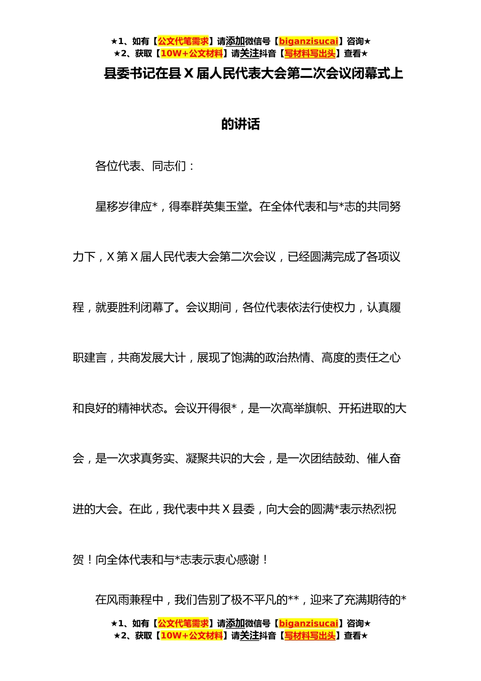★1、如有【公文代笔需求】请添加微信号【biganzisucai】咨询★★2、获取【10W+公文材料】请关注抖音【写材料写出头】查看★县委书记在县X届人民代表大会第二次会议闭幕式上的讲话各位代表、同志们:星移岁律应*,得奉群英集玉堂。在全体代表和与*志的共同努力下,X第X届人民代表大会第二次会议,已经圆满完成了各项议程,就要胜利闭幕了。会议期间,各位代表依法行使权力,认真履职建言,共商发展大计,展现了饱满的政治热情、高度的责任之心和良好的精神状态。会议开得很*,是一次高举旗帜、开拓进取的大会,是一次求真务实、凝聚共识的大会,是一次团结鼓劲、催人奋进的大会。在此,我代表中共X县委,向大会的圆满*表示热烈祝贺!向全体代表和与*志表示衷心感谢!在风雨兼程中,我们告别了极不平凡的**,迎来了...