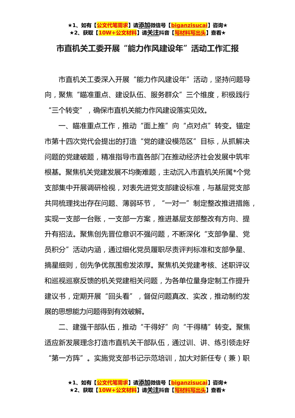★1、如有【公文代笔需求】请添加微信号【biganzisucai】咨询★★2、获取【10W+公文材料】请关注抖音【写材料写出头】查看★市直机关工委开展“能力作风建设年”活动工作汇报市直机关工委深入开展“能力作风建设年”活动,坚持问题导向,聚焦“瞄准重点、建设队伍、服务群众”三个维度,积极践行“三个转变”,确保市直机关能力作风建设落实见效。一、瞄准重点工作,推动“面上推”向“点对点”转变。锚定市第十四次党代会提出的打造“党的建设模范区”目标,从抓解决问题的党建破题,精准指导市直各部门在推动经济社会发展中筑牢根基。聚焦机关党建发展不均衡难题,主动沉入市直机关所属*个党支部集中开展调研检视,对表先进党支部建设标准,与基层党支部共同梳理找出存在问题、薄弱环节,“一对一”制定整改推进...