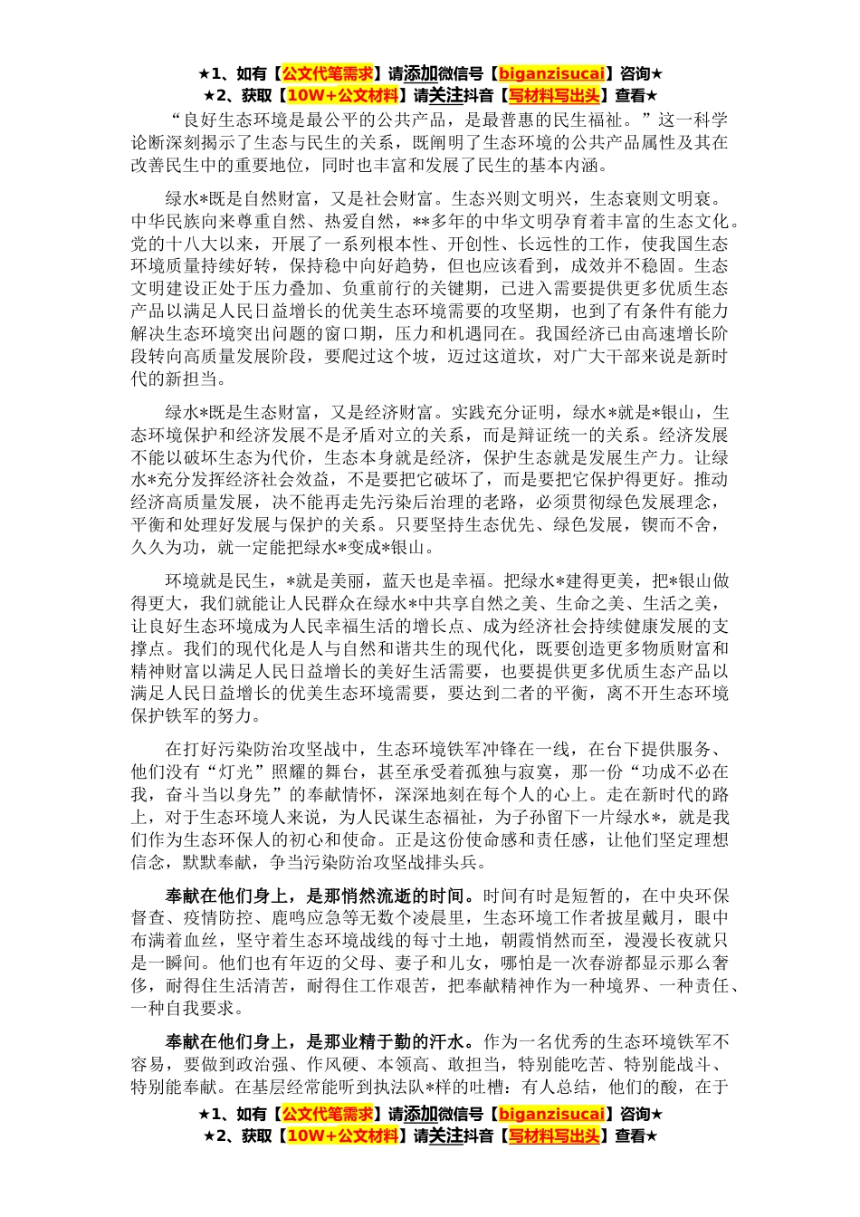 ★1、如有【公文代笔需求】请添加微信号【biganzisucai】咨询★★2、获取【10W+公文材料】请关注抖音【写材料写出头】查看★“良好生态环境是最公平的公共产品,是最普惠的民生福祉。”这一科学论断深刻揭示了生态与民生的关系,既阐明了生态环境的公共产品属性及其在改善民生中的重要地位,同时也丰富和发展了民生的基本内涵。绿水*既是自然财富,又是社会财富。生态兴则文明兴,生态衰则文明衰。中华民族向来尊重自然、热爱自然,**多年的中华文明孕育着丰富的生态文化。党的十八大以来,开展了一系列根本性、开创性、长远性的工作,使我国生态环境质量持续好转,保持稳中向好趋势,但也应该看到,成效并不稳固。生态文明建设正处于压力叠加、负重前行的关键期,已进入需要提供更多优质生态产品以满足人民日益增...