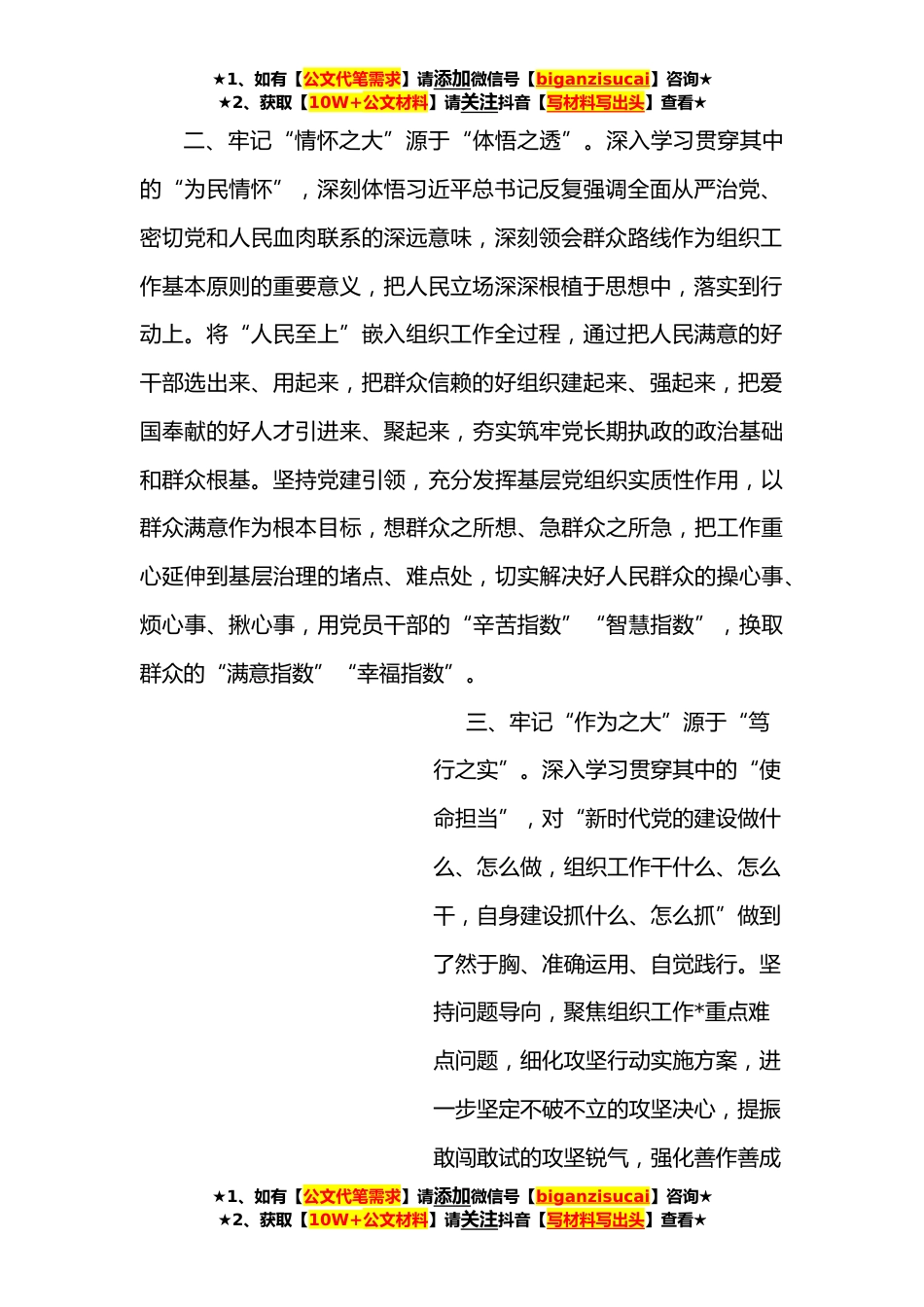 ★1、如有【公文代笔需求】请添加微信号【biganzisucai】咨询★★2、获取【10W+公文材料】请关注抖音【写材料写出头】查看★推动组织工作高质量发展研讨发言材料全省组织部长会议明确提出,全省组织部门要进一步提高政治站位、坚定“胸怀大我”的价值追求,要求认真阅研“两篇讲话、两份文件、两段阐述”。这既是组织路线服务政治路线的客观要求,也是组织工作助推中心工作的现实需要,更是组织优势增创发展优势的必然选择。组工干部必须将“两篇讲话、两份文件、两段阐述”专题学习作为谋思路、出实招、破难题的“金钥匙”,学深、悟透、笃行,以大格局、大情怀、大作为,扛起新使命,谱写新篇章。一、牢记“格局之大”源于“学习之深”。深入学习贯穿其中的“大局观念”,全面领*解以习近平同志为核心的党中央全...