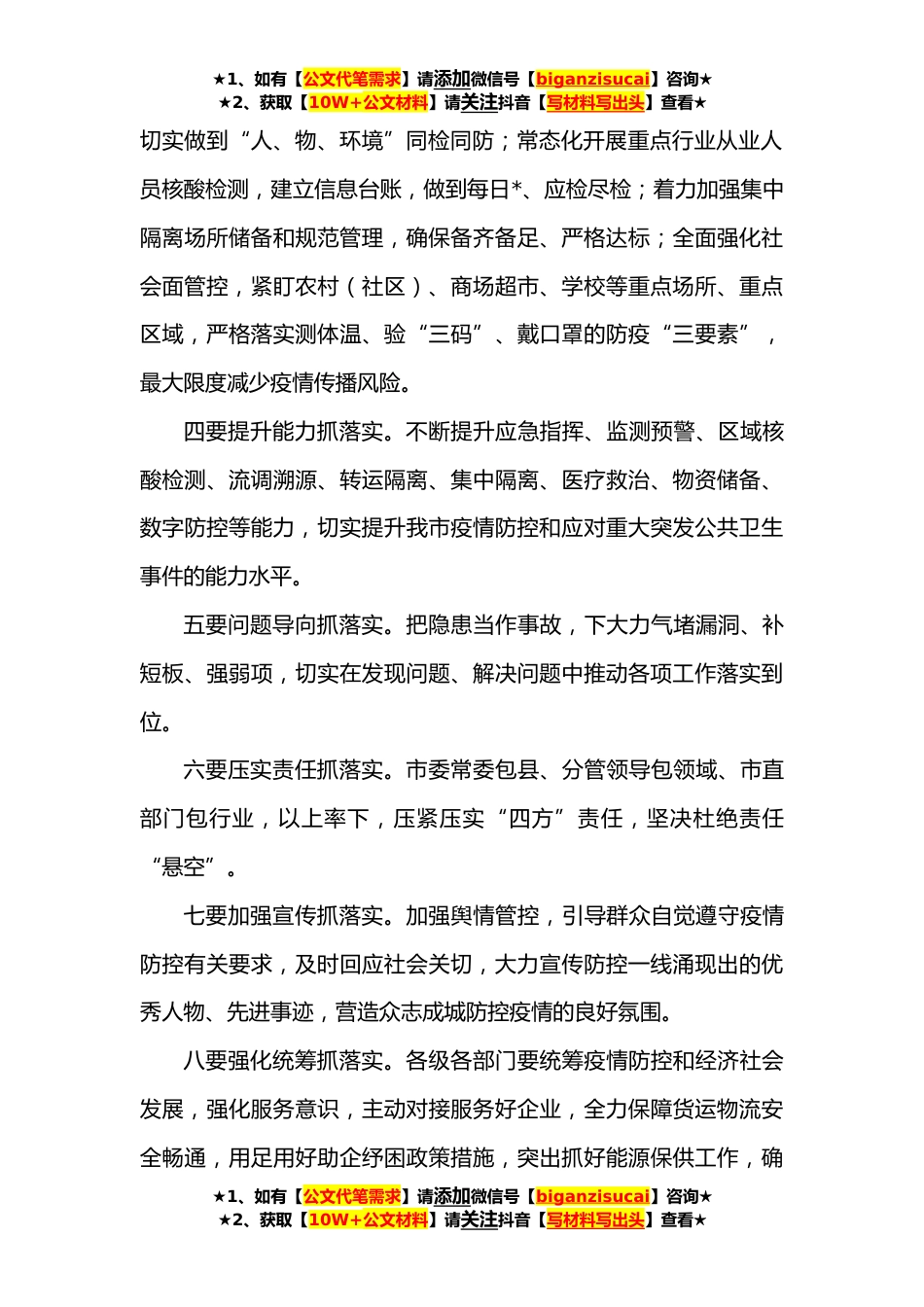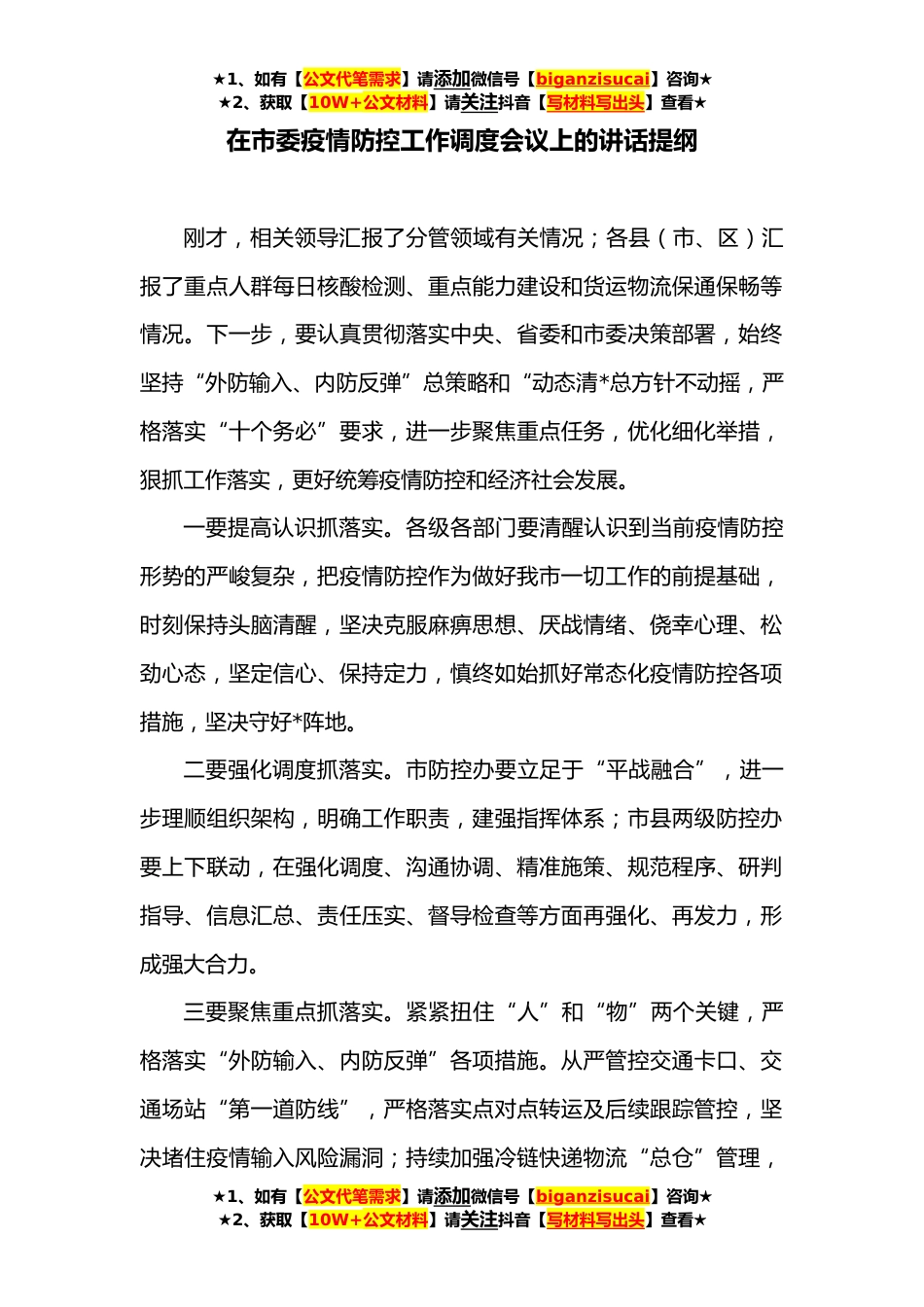 ★1、如有【公文代笔需求】请添加微信号【biganzisucai】咨询★★2、获取【10W+公文材料】请关注抖音【写材料写出头】查看★在市委疫情防控工作调度会议上的讲话提纲刚才,相关领导汇报了分管领域有关情况;各县(市、区)汇报了重点人群每日核酸检测、重点能力建设和货运物流保通保畅等情况。下一步,要认真贯彻落实中央、省委和市委决策部署,始终坚持“外防输入、内防反弹”总策略和“动态清*总方针不动摇,严格落实“十个务必”要求,进一步聚焦重点任务,优化细化举措,狠抓工作落实,更好统筹疫情防控和经济社会发展。一要提高认识抓落实。各级各部门要清醒认识到当前疫情防控形势的严峻复杂,把疫情防控作为做好我市一切工作的前提基础,时刻保持头脑清醒,坚决克服麻痹思想、厌战情绪、侥幸心理、松劲心态...