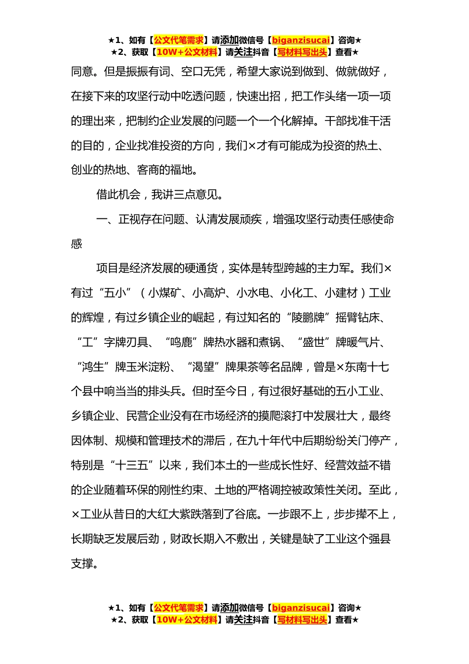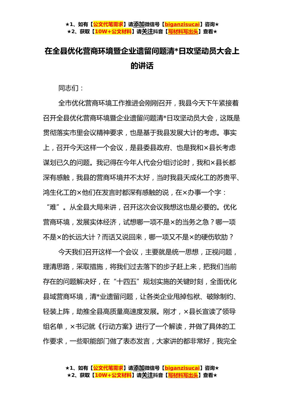 ★1、如有【公文代笔需求】请添加微信号【biganzisucai】咨询★★2、获取【10W+公文材料】请关注抖音【写材料写出头】查看★在全县优化营商环境暨企业遗留问题清*日攻坚动员大会上的讲话同志们:全市优化营商环境工作推进会刚刚召开,我县今天下午紧接着召开全县优化营商环境暨企业遗留问题清*日攻坚动员大会,这既是贯彻落实市里会议精神要求,也是基于我县发展大计的考虑。事实上,召开今天这样一个会议,是县委县政府、也是我和×县长考虑谋划已久的问题。我记得在今年人代会分组讨论时,我和×县长都深有感触,我县的营商环境并不太好,当时我县天成化工的苏贵平、鸿生化工的×他们在发言时都深有感触的说,在×办事一个字:“难”。从全县大局来讲,召开这次会议我想这也是必要的。优化营商环境,发展实体经...