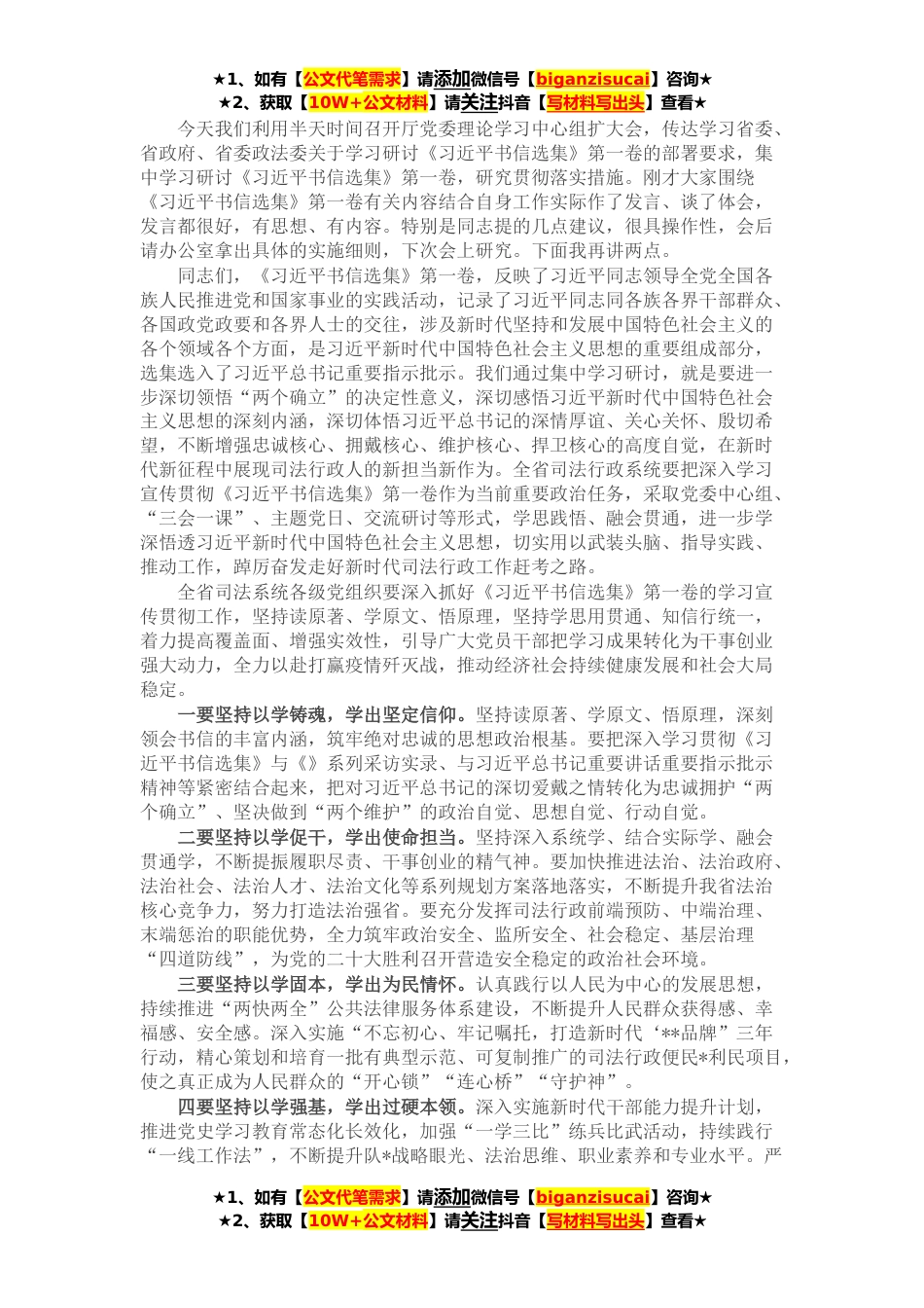 ★1、如有【公文代笔需求】请添加微信号【biganzisucai】咨询★★2、获取【10W+公文材料】请关注抖音【写材料写出头】查看★今天我们利用半天时间召开厅党委理论学习中心组扩大会,传达学习省委、省政府、省委政法委关于学习研讨《习近平书信选集》第一卷的部署要求,集中学习研讨《习近平书信选集》第一卷,研究贯彻落实措施。刚才大家围绕《习近平书信选集》第一卷有关内容结合自身工作实际作了发言、谈了体会,发言都很好,有思想、有内容。特别是同志提的几点建议,很具操作性,会后请办公室拿出具体的实施细则,下次会上研究。下面我再讲两点。同志们,《习近平书信选集》第一卷,反映了习近平同志领导全党全国各族人民推进党和国家事业的实践活动,记录了习近平同志同各族各界干部群众、各国政党政要和各界...