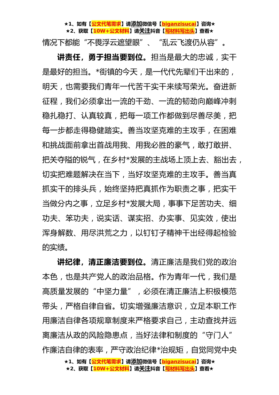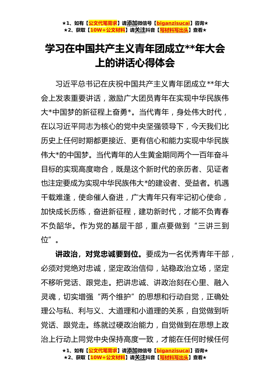 ★1、如有【公文代笔需求】请添加微信号【biganzisucai】咨询★★2、获取【10W+公文材料】请关注抖音【写材料写出头】查看★学习在中国共产主义青年团成立**年大会上的讲话心得体会习近平总书记在庆祝中国共产主义青年团成立**年大会上发表重要讲话,激励广大团员青年在实现中华民族伟大*中国梦的新征程上奋勇*。当代青年,身处伟大时代,在以习近平同志为核心的党中央坚强领导下,今天我们比历史上任何时期都更接近、更有信心和能力实现中华民族伟大*的中国梦。当代青年的人生黄金期同两个一百年奋斗目标的实现高度吻合,既是这个新时代的亲历者、见证者也注定要成为实现中华民族伟大*的建设者、受益者。机遇千载难逢,使命催人奋进,广大青年只有牢记初心使命,加快成长历练,奋进新征程,建功新时代,才能不负...