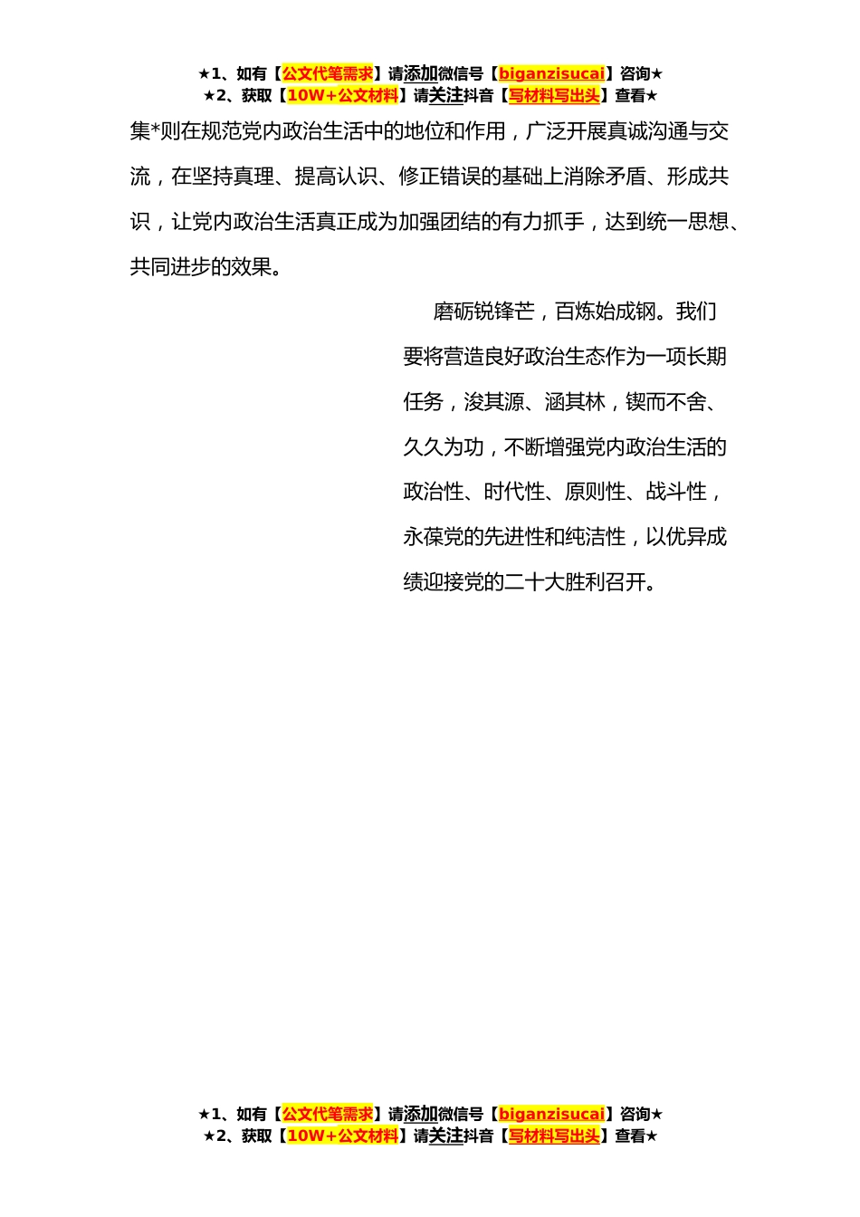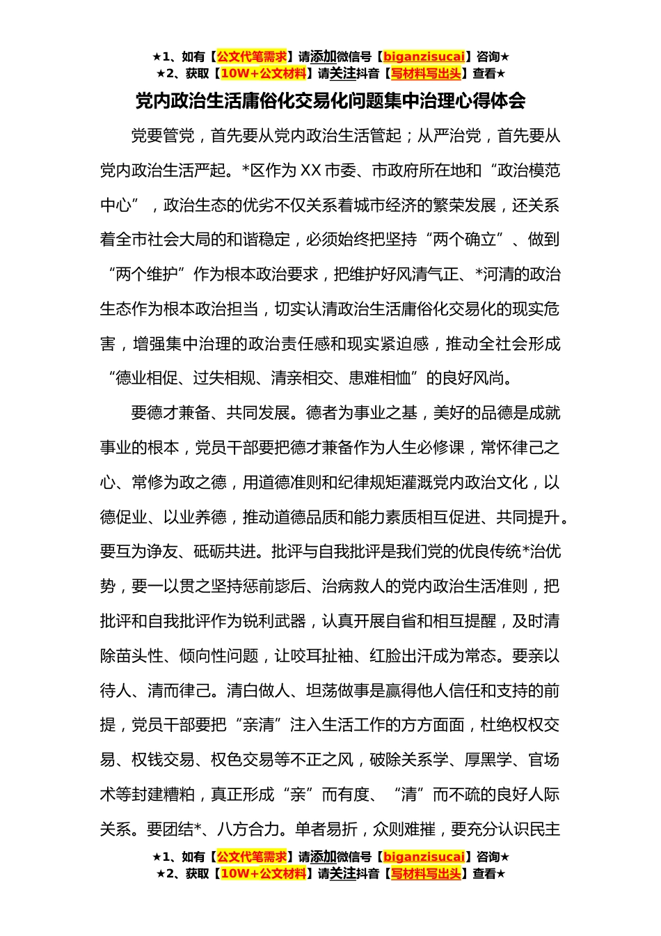 ★1、如有【公文代笔需求】请添加微信号【biganzisucai】咨询★★2、获取【10W+公文材料】请关注抖音【写材料写出头】查看★党内政治生活庸俗化交易化问题集中治理心得体会党要管党,首先要从党内政治生活管起;从严治党,首先要从党内政治生活严起。*区作为XX市委、市政府所在地和“政治模范中心”,政治生态的优劣不仅关系着城市经济的繁荣发展,还关系着全市社会大局的和谐稳定,必须始终把坚持“两个确立”、做到“两个维护”作为根本政治要求,把维护好风清气正、*河清的政治生态作为根本政治担当,切实认清政治生活庸俗化交易化的现实危害,增强集中治理的政治责任感和现实紧迫感,推动全社会形成“德业相促、过失相规、清亲相交、患难相恤”的良好风尚。要德才兼备、共同发展。德者为事业之基,美好的品德...
