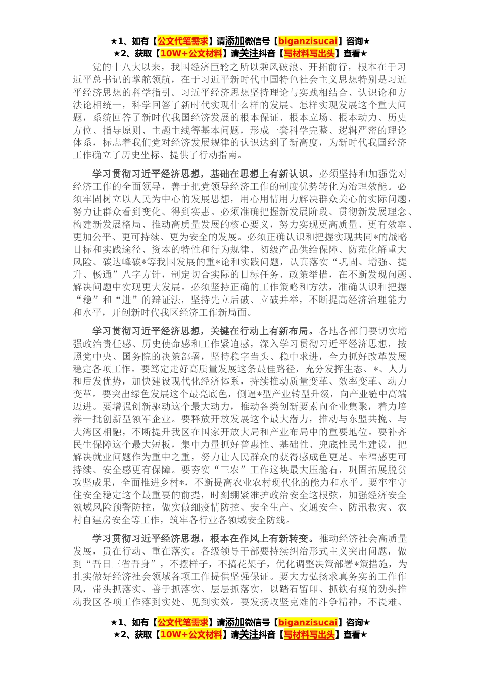 ★1、如有【公文代笔需求】请添加微信号【biganzisucai】咨询★★2、获取【10W+公文材料】请关注抖音【写材料写出头】查看★党的十八大以来,我国经济巨轮之所以乘风破浪、开拓前行,根本在于习近平总书记的掌舵领航,在于习近平新时代中国特色社会主义思想特别是习近平经济思想的科学指引。习近平经济思想坚持理论与实践相结合、认识论和方法论相统一,科学回答了新时代实现什么样的发展、怎样实现发展这个重大问题,系统回答了新时代我国经济发展的根本保证、根本立场、根本动力、历史方位、指导原则、主题主线等基本问题,形成一套科学完整、逻辑严密的理论体系,标志着我们党对经济发展规律的认识达到了新高度,为新时代我国经济工作确立了历史坐标、提供了行动指南。学习贯彻习近平经济思想,基础在思想上有...