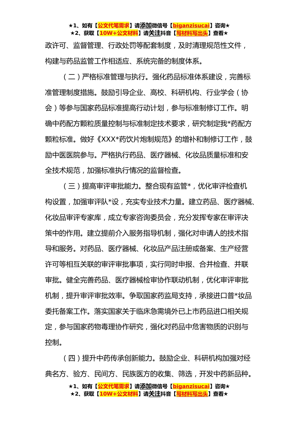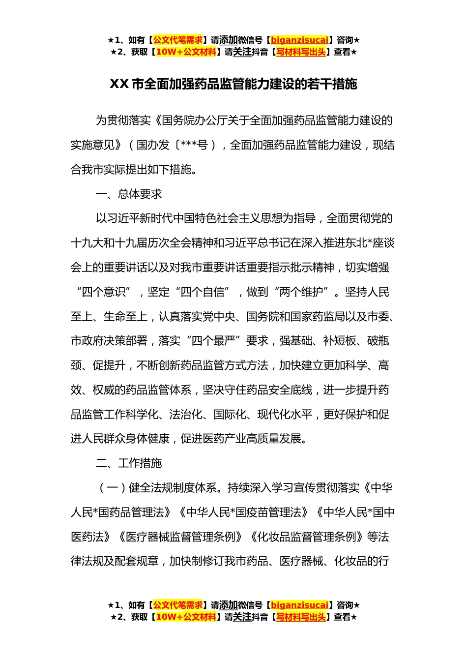 ★1、如有【公文代笔需求】请添加微信号【biganzisucai】咨询★★2、获取【10W+公文材料】请关注抖音【写材料写出头】查看★XX市全面加强药品监管能力建设的若干措施为贯彻落实《国务院办公厅关于全面加强药品监管能力建设的实施意见》(国办发〔***号),全面加强药品监管能力建设,现结合我市实际提出如下措施。一、总体要求以习近平新时代中国特色社会主义思想为指导,全面贯彻党的十九大和十九届历次全会精神和习近平总书记在深入推进东北*座谈会上的重要讲话以及对我市重要讲话重要指示批示精神,切实增强“四个意识”,坚定“四个自信”,做到“两个维护”。坚持人民至上、生命至上,认真落实党中央、国务院和国家药监局以及市委、市政府决策部署,落实“四个最严”要求,强基础、补短板、破瓶颈、促提升,...
