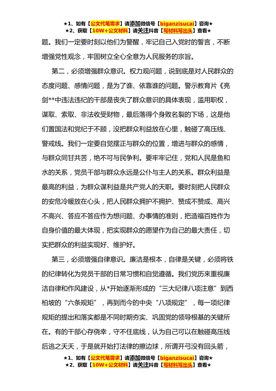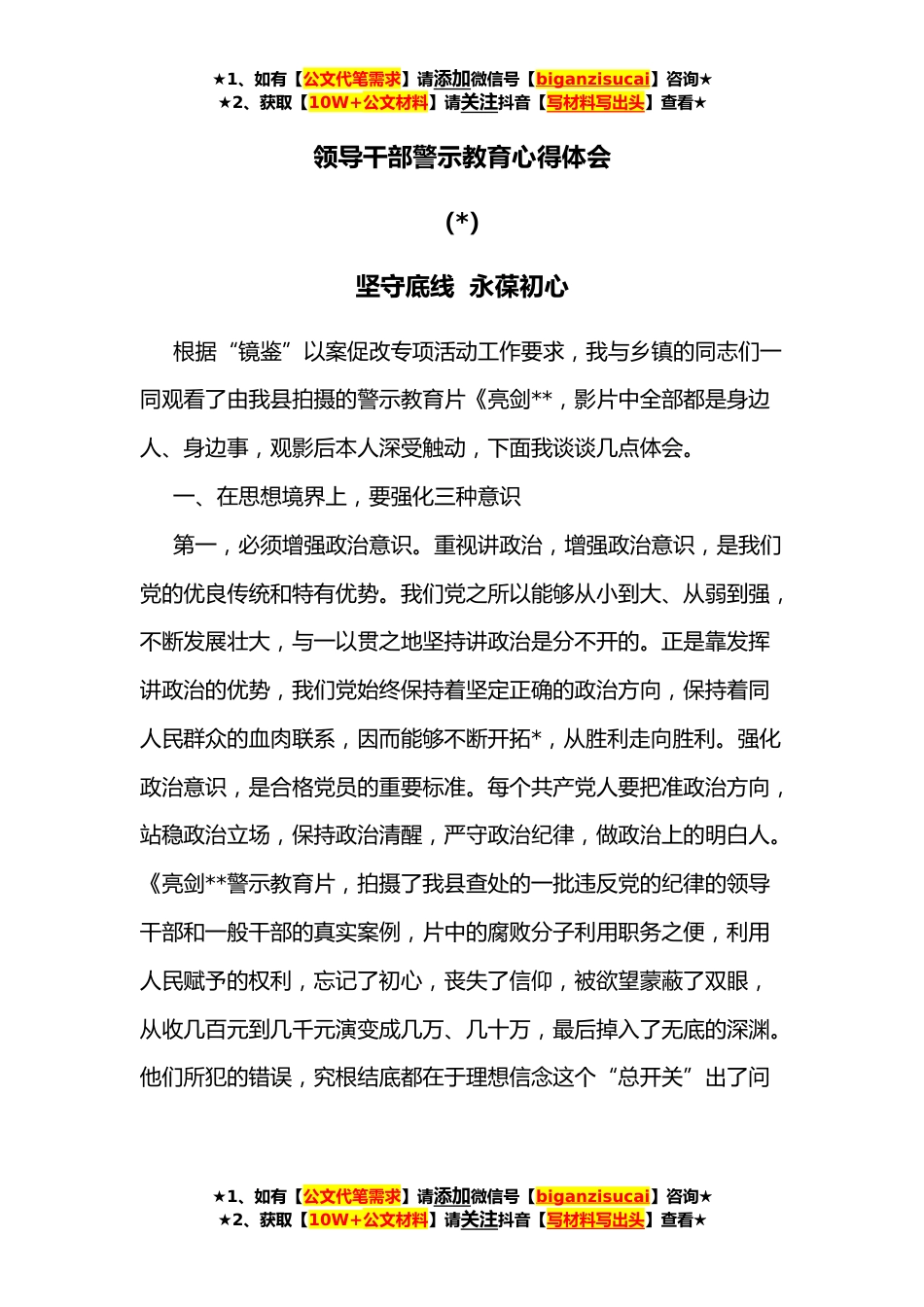★1、如有【公文代笔需求】请添加微信号【biganzisucai】咨询★★2、获取【10W+公文材料】请关注抖音【写材料写出头】查看★领导干部警示教育心得体会(*)坚守底线永葆初心根据“镜鉴”以案促改专项活动工作要求,我与乡镇的同志们一同观看了由我县拍摄的警示教育片《亮剑**,影片中全部都是身边人、身边事,观影后本人深受触动,下面我谈谈几点体会。一、在思想境界上,要强化三种意识第一,必须增强政治意识。重视讲政治,增强政治意识,是我们党的优良传统和特有优势。我们党之所以能够从小到大、从弱到强,不断发展壮大,与一以贯之地坚持讲政治是分不开的。正是靠发挥讲政治的优势,我们党始终保持着坚定正确的政治方向,保持着同人民群众的血肉联系,因而能够不断开拓*,从胜利走向胜利。强化政治意识,是...