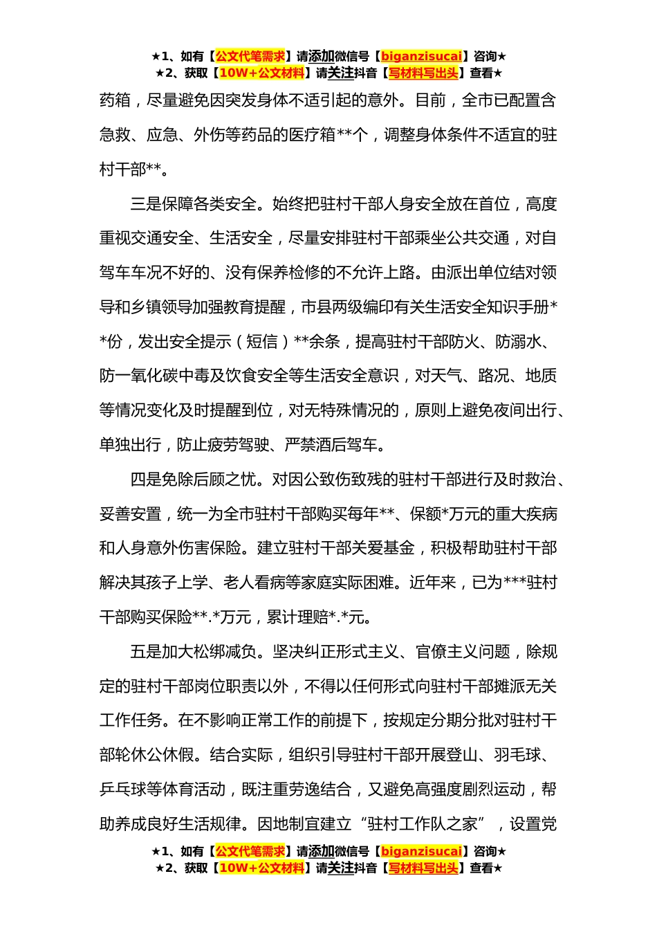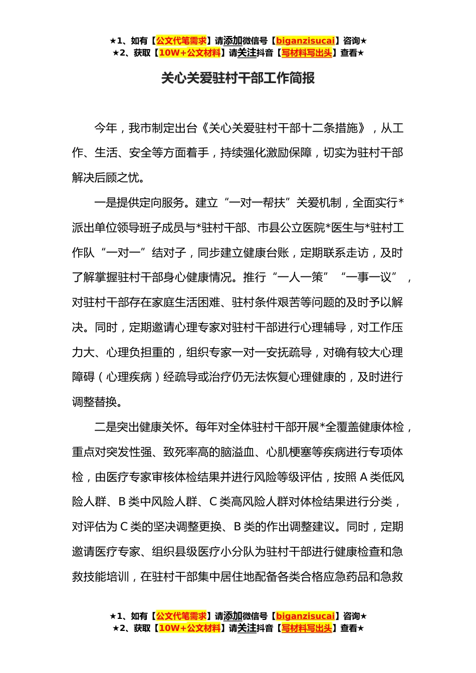 ★1、如有【公文代笔需求】请添加微信号【biganzisucai】咨询★★2、获取【10W+公文材料】请关注抖音【写材料写出头】查看★关心关爱驻村干部工作简报今年,我市制定出台《关心关爱驻村干部十二条措施》,从工作、生活、安全等方面着手,持续强化激励保障,切实为驻村干部解决后顾之忧。一是提供定向服务。建立“一对一帮扶”关爱机制,全面实行*派出单位领导班子成员与*驻村干部、市县公立医院*医生与*驻村工作队“一对一”结对子,同步建立健康台账,定期联系走访,及时了解掌握驻村干部身心健康情况。推行“一人一策”“一事一议”,对驻村干部存在家庭生活困难、驻村条件艰苦等问题的及时予以解决。同时,定期邀请心理专家对驻村干部进行心理辅导,对工作压力大、心理负担重的,组织专家一对一安抚疏导,对确...