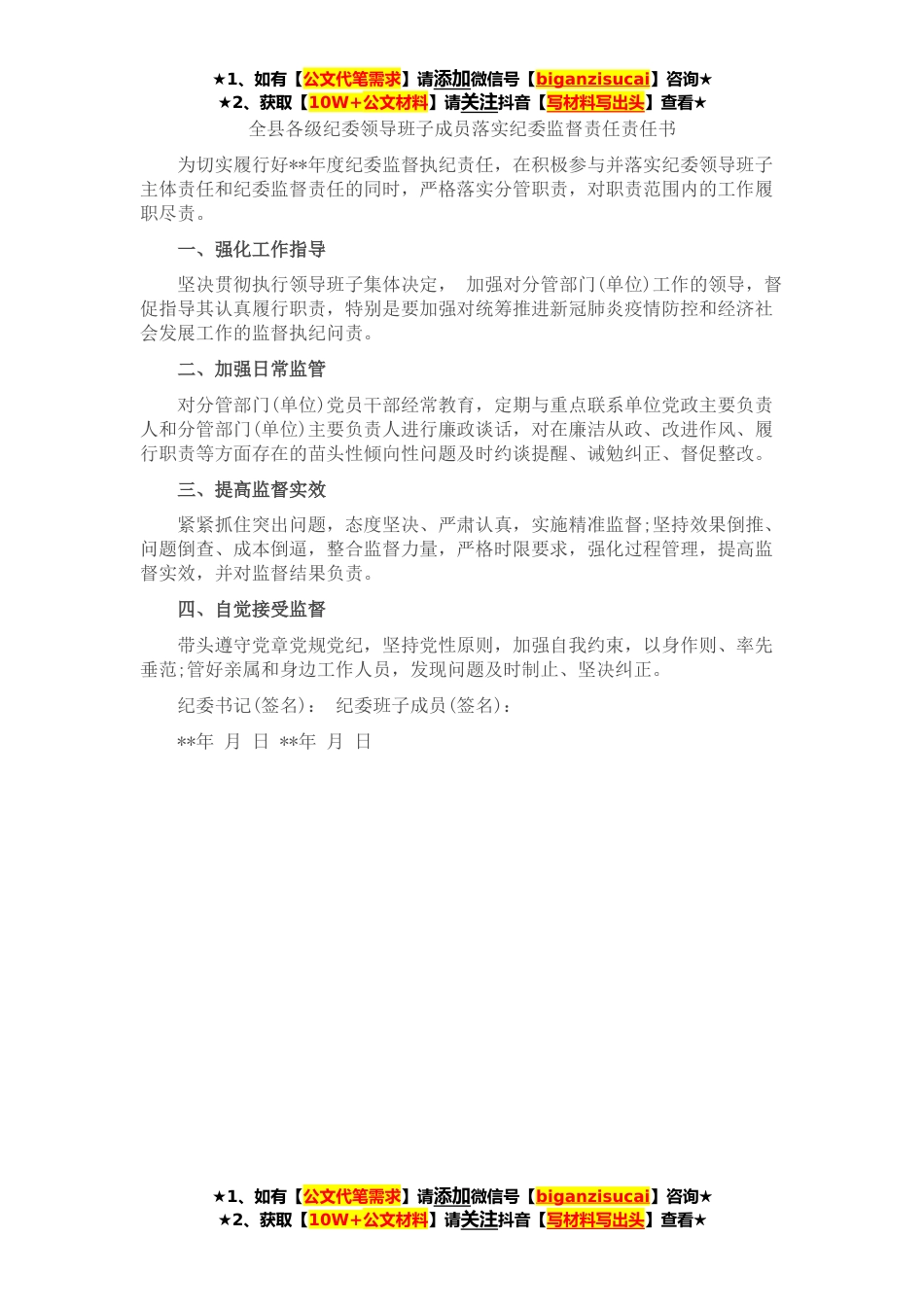 ★1、如有【公文代笔需求】请添加微信号【biganzisucai】咨询★★2、获取【10W+公文材料】请关注抖音【写材料写出头】查看★全县各级纪委领导班子成员落实纪委监督责任责任书为切实履行好**年度纪委监督执纪责任,在积极参与并落实纪委领导班子主体责任和纪委监督责任的同时,严格落实分管职责,对职责范围内的工作履职尽责。一、强化工作指导坚决贯彻执行领导班子集体决定,加强对分管部门(单位)工作的领导,督促指导其认真履行职责,特别是要加强对统筹推进新冠肺炎疫情防控和经济社会发展工作的监督执纪问责。二、加强日常监管对分管部门(单位)党员干部经常教育,定期与重点联系单位党政主要负责人和分管部门(单位)主要负责人进行廉政谈话,对在廉洁从政、改进作风、履行职责等方面存在的苗头性倾向性问题及时...