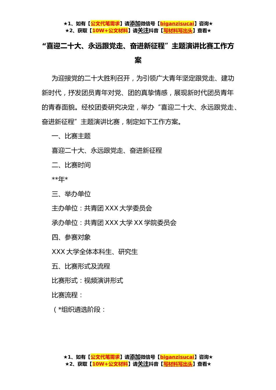 ★1、如有【公文代笔需求】请添加微信号【biganzisucai】咨询★★2、获取【10W+公文材料】请关注抖音【写材料写出头】查看★“喜迎二十大、永远跟党走、奋进新征程”主题演讲比赛工作方案为迎接党的二十大胜利召开,为引领广大青年坚定跟党走、建功新时代,抒发团员青年对党、团的真挚情感,展现新时代团员青年的青春面貌。经校团委研究决定,举办“喜迎二十大、永远跟党走、奋进新征程”主题演讲比赛,制定如下工作方案。一、比赛主题喜迎二十大、永远跟党走、奋进新征程二、比赛时间**年*三、举办单位主办单位:共青团XXX大学委员会承办单位:共青团XXX大学XX学院委员会四、参赛对象XXX大学全体本科生、研究生五、比赛形式及流程比赛形式:视频演讲形式比赛流程:(*组织遴选阶段:★1、如有【公文代笔需求】请...