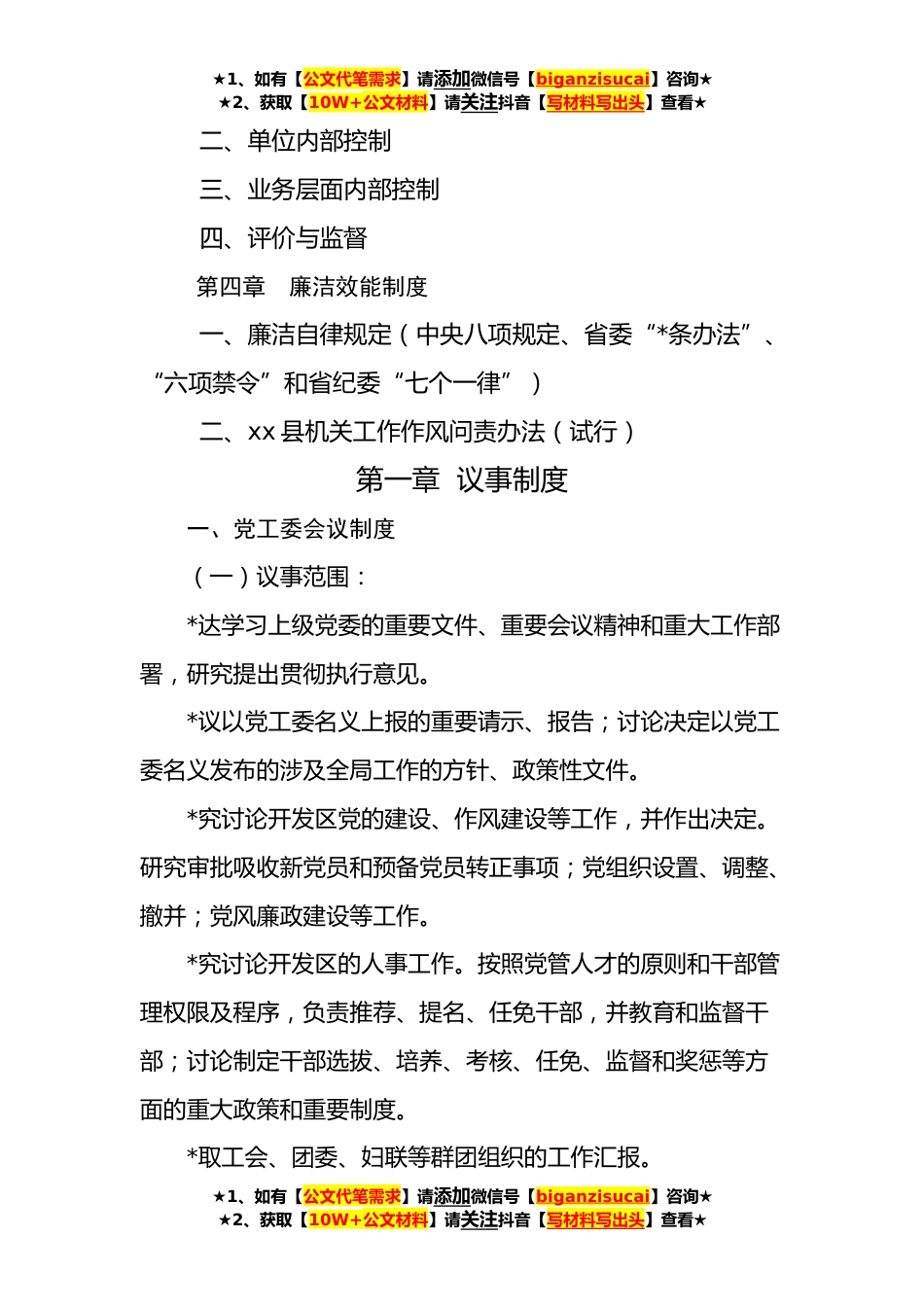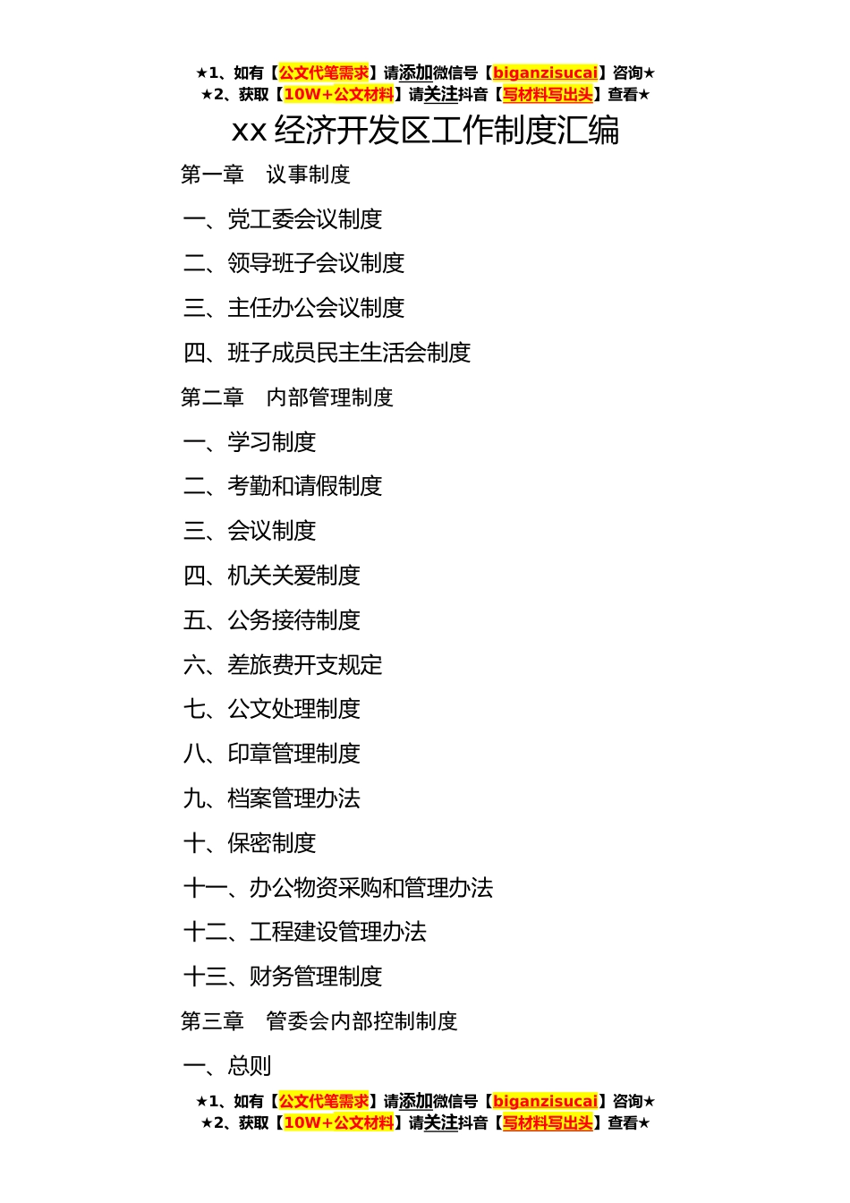 ★1、如有【公文代笔需求】请添加微信号【biganzisucai】咨询★★2、获取【10W+公文材料】请关注抖音【写材料写出头】查看★xx经济开发区工作制度汇编第一章议事制度一、党工委会议制度二、领导班子会议制度三、主任办公会议制度四、班子成员民主生活会制度第二章内部管理制度一、学习制度二、考勤和请假制度三、会议制度四、机关关爱制度五、公务接待制度六、差旅费开支规定七、公文处理制度八、印章管理制度九、档案管理办法十、保密制度十一、办公物资采购和管理办法十二、工程建设管理办法十三、财务管理制度第三章管委会内部控制制度一、总则★1、如有【公文代笔需求】请添加微信号【biganzisucai】咨询★★2、获取【10W+公文材料】请关注抖音【写材料写出头】查看★★1、如有【公文代笔需求】请添加微信号【...