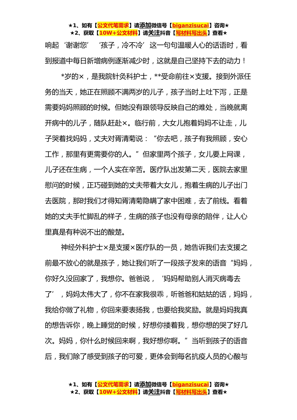 ★1、如有【公文代笔需求】请添加微信号【biganzisucai】咨询★★2、获取【10W+公文材料】请关注抖音【写材料写出头】查看★护士参加全区卫健系统百姓宣讲活动宣讲稿:在践行责任中撑起抗疫一片天有一种巾帼奉献,温暖他人、点亮生命;有一种巾帼力量,坚忍不拔、奋战到底;有一种巾帼担当,挺身而出、无所畏惧!抗击疫情的战场上,一群同死神赛跑、与病毒博弈、和时间抢命的人,他们是母亲、是妻子、是女儿,但在疫情面前,他们只有一个身份,白衣战士。×是眼科副护士长,也是援×医护队的一员。**是她连续在岗的第*天,接到外派任务后,一直没休息的她毫无怨言,当晚随队去了一线。经过近*小时的长途行程到达×,稍作短暂休息就奔赴采集点投入到紧张的工作中。每天穿着笨重的防护服,冒着寒风走街串巷,爬楼入...