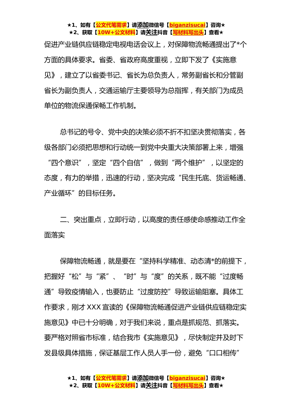 ★1、如有【公文代笔需求】请添加微信号【biganzisucai】咨询★★2、获取【10W+公文材料】请关注抖音【写材料写出头】查看★在全市保障物流畅通促进产业链供应链稳定电视电话会议上的讲话同志们:刚才,XX同志传达了全国会议精神,宣读了我市《实施意见》,下面我再强调三个方面:一、提高站位,强化认识,坚决把思想和行动统一到党中央决策部署上来近期,国内疫情多点散发,波及多个省份,部分地方因疫情防控而采取的通行管控措施限制了物流畅通,严重影响人民群众正常生活、影响产业链供应链稳定、影响经济平稳健康发展。为此,党中央高度重视。**日,XXX总书记主持召开中央政治局常委会,在分析研究新冠疫情形势时,明确要求“要保持战略定力,坚持稳中求进,统筹好疫情防控和经济社会发展,采取更加有效措施,...