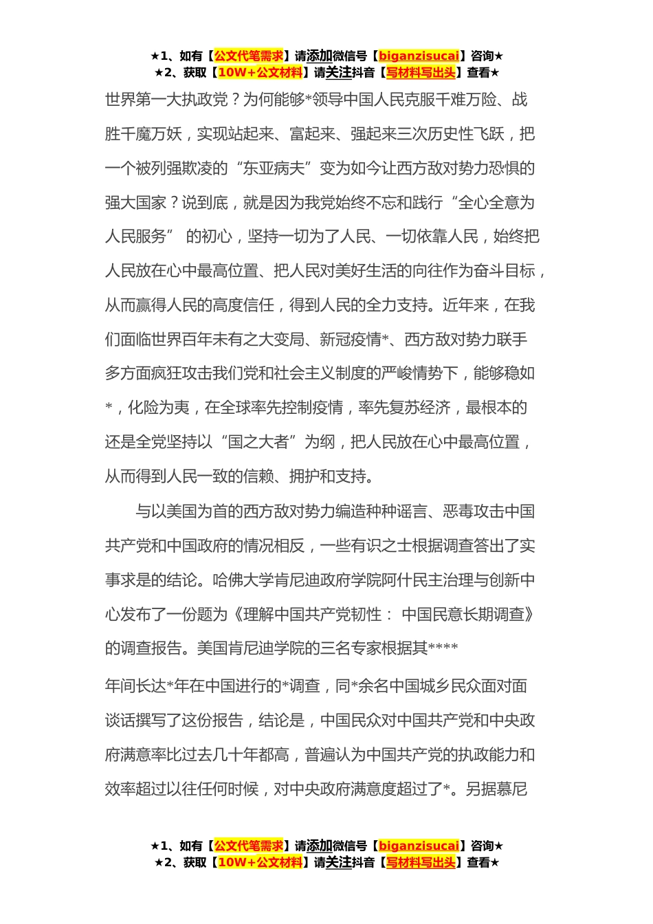 ★1、如有【公文代笔需求】请添加微信号【biganzisucai】咨询★★2、获取【10W+公文材料】请关注抖音【写材料写出头】查看★目录“国之大者”,执政之纲*“国之大者”:理解当代中国国家治理体系的一个基点*“国之大者”的理论特质和实践路径*“国之大者”的深刻内涵及时代指向*“国之大者”,执政之纲今年开春以来,在以习近平同志为核心的党中央领导下,全党以学党史、悟思想、办实事、开新局的实际行动,迎接和庆祝中国共产党百岁华诞。我们要深刻领悟习近平总书记在庆祝中国共产党成立**年大会上强调的:“*就是人民、人民就是*,打*、守*,守的是人民的心”,“中国共产党根基在人民、血脉在人民、力量在人民”,“新的征程上,我们必须紧紧依靠人民创造历史,坚持全心全意为人民服务的根本宗旨,站稳人民立...