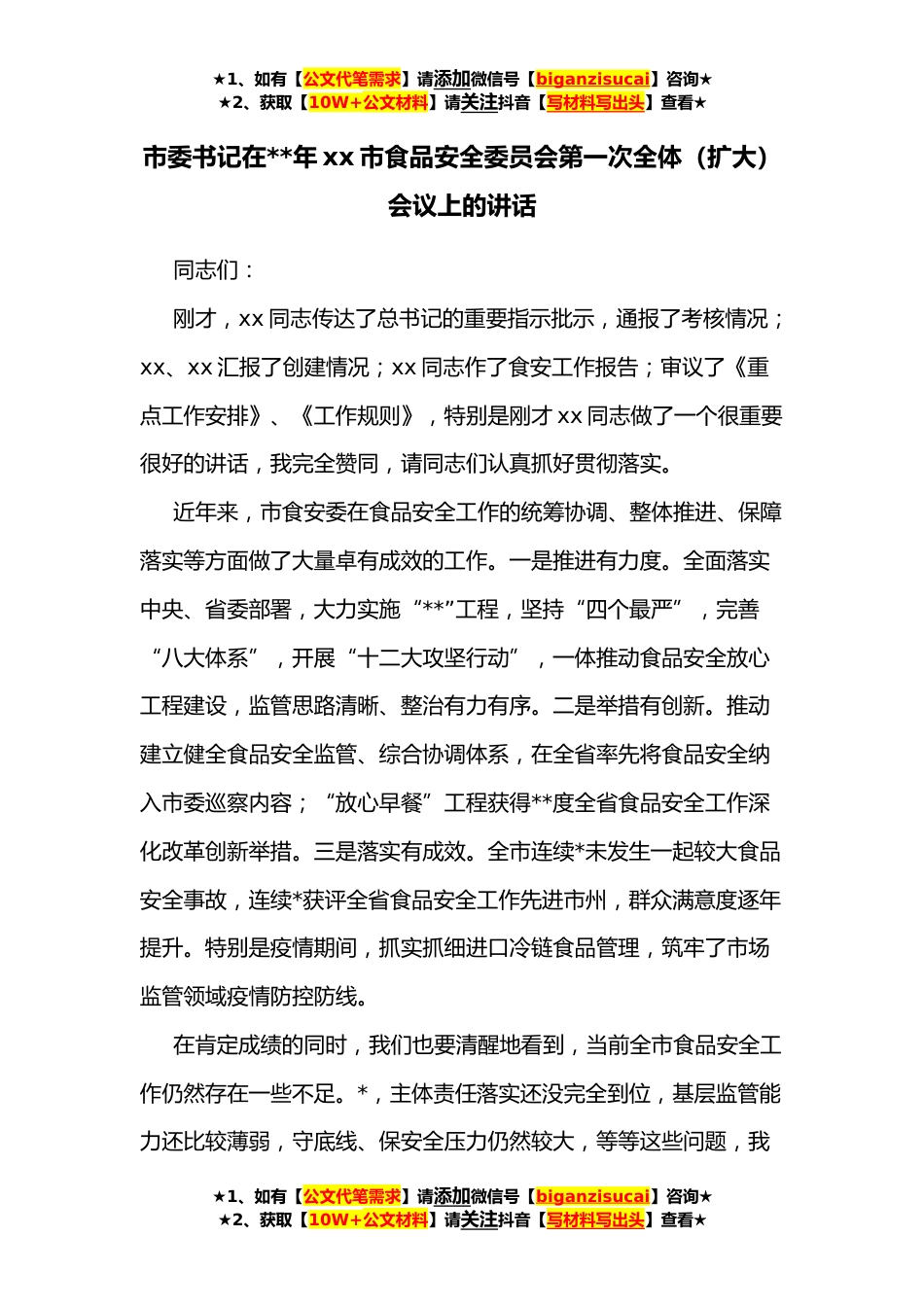 ★1、如有【公文代笔需求】请添加微信号【biganzisucai】咨询★★2、获取【10W+公文材料】请关注抖音【写材料写出头】查看★市委书记在**年xx市食品安全委员会第一次全体(扩大)会议上的讲话同志们:刚才,xx同志传达了总书记的重要指示批示,通报了考核情况;xx、xx汇报了创建情况;xx同志作了食安工作报告;审议了《重点工作安排》、《工作规则》,特别是刚才xx同志做了一个很重要很好的讲话,我完全赞同,请同志们认真抓好贯彻落实。近年来,市食安委在食品安全工作的统筹协调、整体推进、保障落实等方面做了大量卓有成效的工作。一是推进有力度。全面落实中央、省委部署,大力实施“**”工程,坚持“四个最严”,完善“八大体系”,开展“十二大攻坚行动”,一体推动食品安全放心工程建设,监管思路清晰、整...
