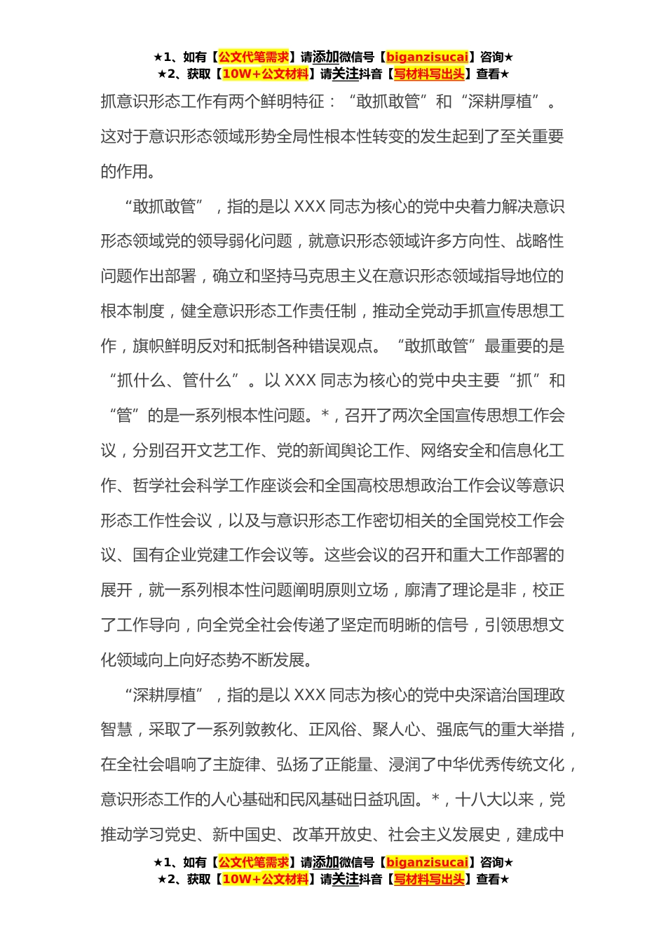 ★1、如有【公文代笔需求】请添加微信号【biganzisucai】咨询★★2、获取【10W+公文材料】请关注抖音【写材料写出头】查看★党课讲稿:意识形态领域形势何以发生全局性根本性转变党的十九届六中全会通过的《中共中央关于党的百年奋斗重大成就和历史经验的决议》(以下简称《决议》)指出:“党的十八大以来,我国意识形态领域形势发生全局性、根本性转变,全党全国各族人民文化自信明显增强,全社会凝聚力和向心力极大提升,为新时代开创党和国家事业新局面提供了坚强思想保证和强大精神力量。”对于这种转变的重大意义,如果联系十八大之前乃至改革开放以来意识形态领域存在的情况和问题,就能够体会得更加深刻。就如《决议》指出的,改革开放以来的意识形态领域,“拜金主义、享乐主义、极端个人主义和历史虚无...