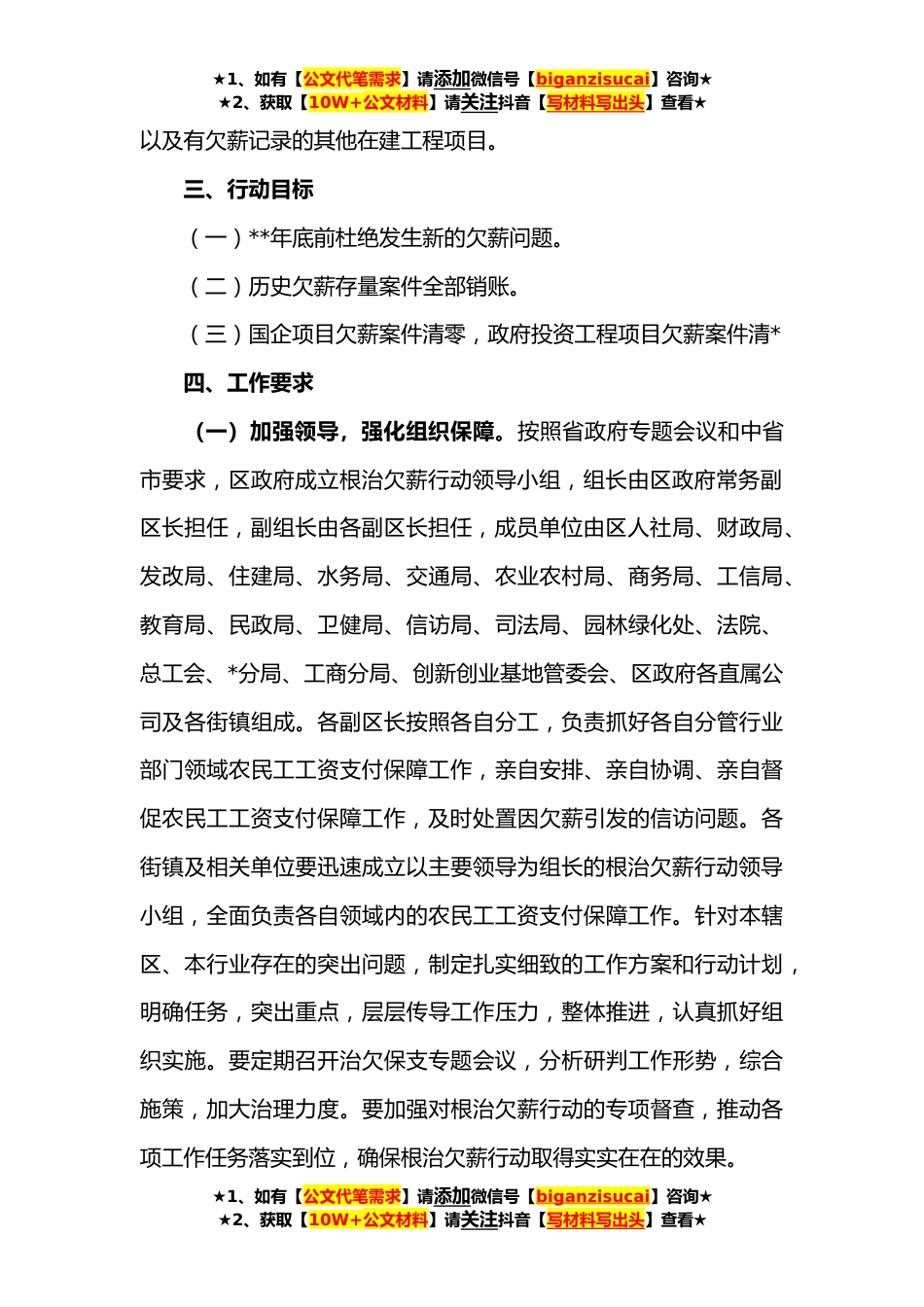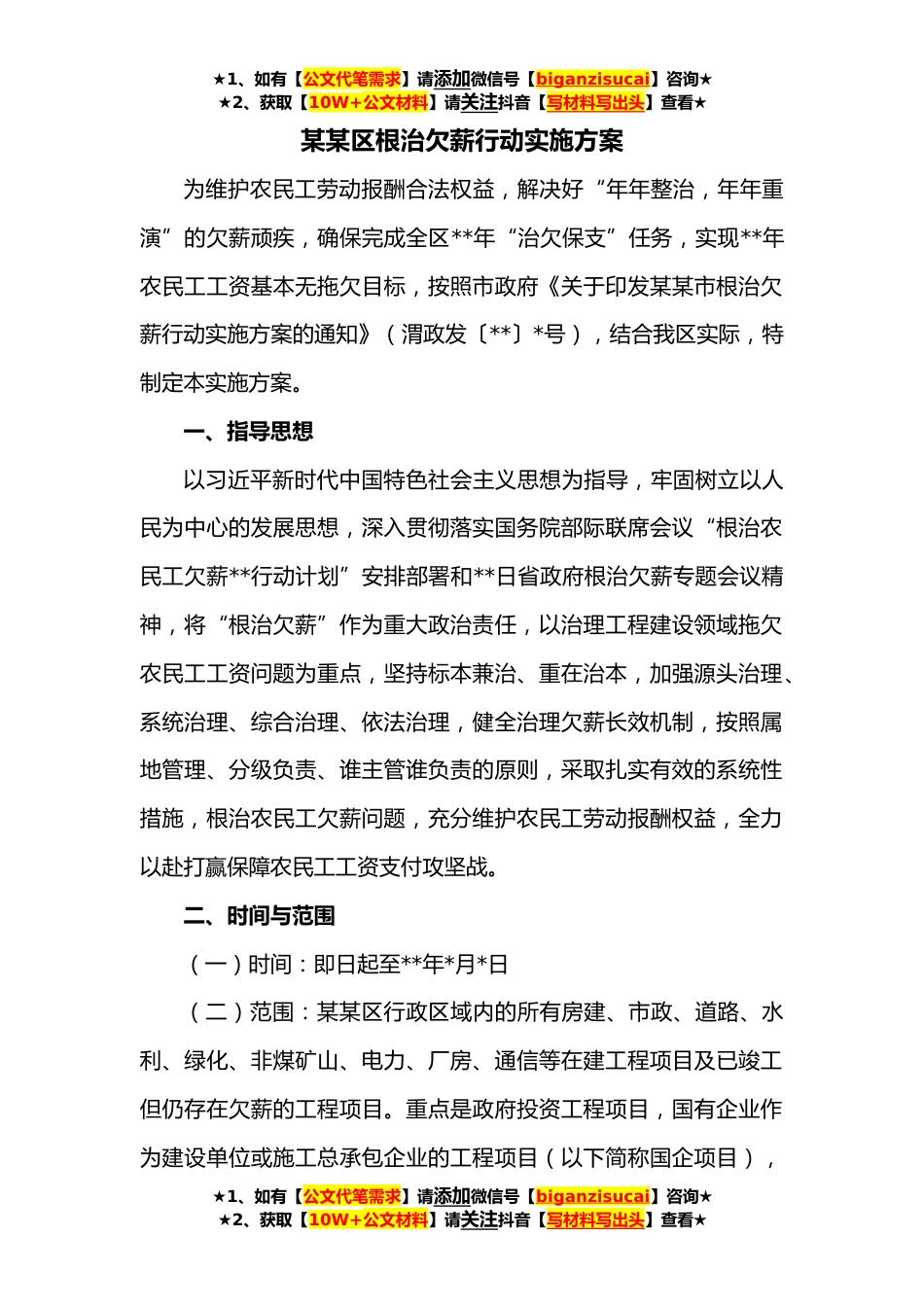★1、如有【公文代笔需求】请添加微信号【biganzisucai】咨询★★2、获取【10W+公文材料】请关注抖音【写材料写出头】查看★某某区根治欠薪行动实施方案为维护农民工劳动报酬合法权益,解决好“年年整治,年年重演”的欠薪顽疾,确保完成全区**年“治欠保支”任务,实现**年农民工工资基本无拖欠目标,按照市政府《关于印发某某市根治欠薪行动实施方案的通知》(渭政发〔**〕*号),结合我区实际,特制定本实施方案。一、指导思想以习近平新时代中国特色社会主义思想为指导,牢固树立以人民为中心的发展思想,深入贯彻落实国务院部际联席会议“根治农民工欠薪**行动计划”安排部署和**日省政府根治欠薪专题会议精神,将“根治欠薪”作为重大政治责任,以治理工程建设领域拖欠农民工工资问题为重点,坚持标本兼治、...