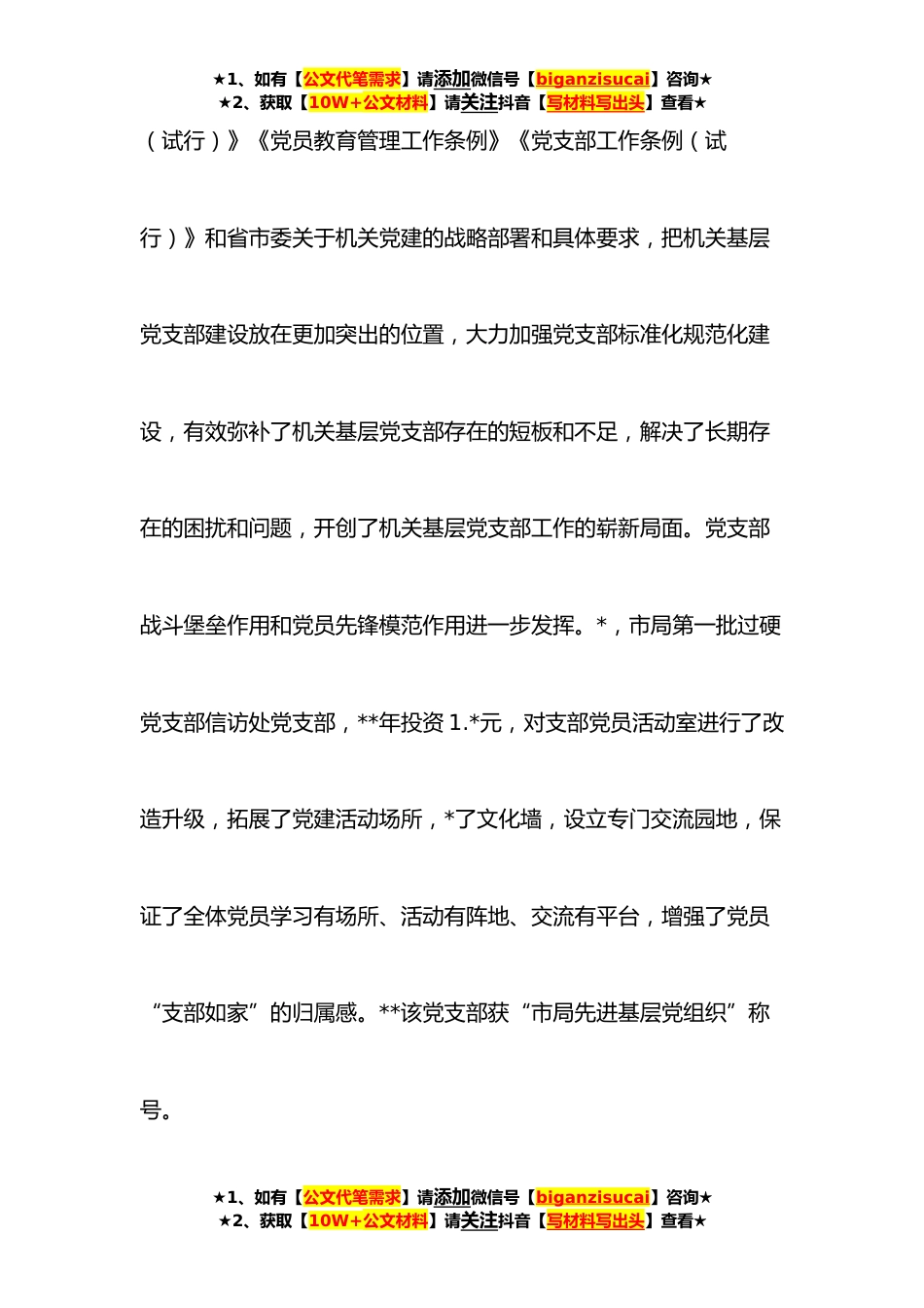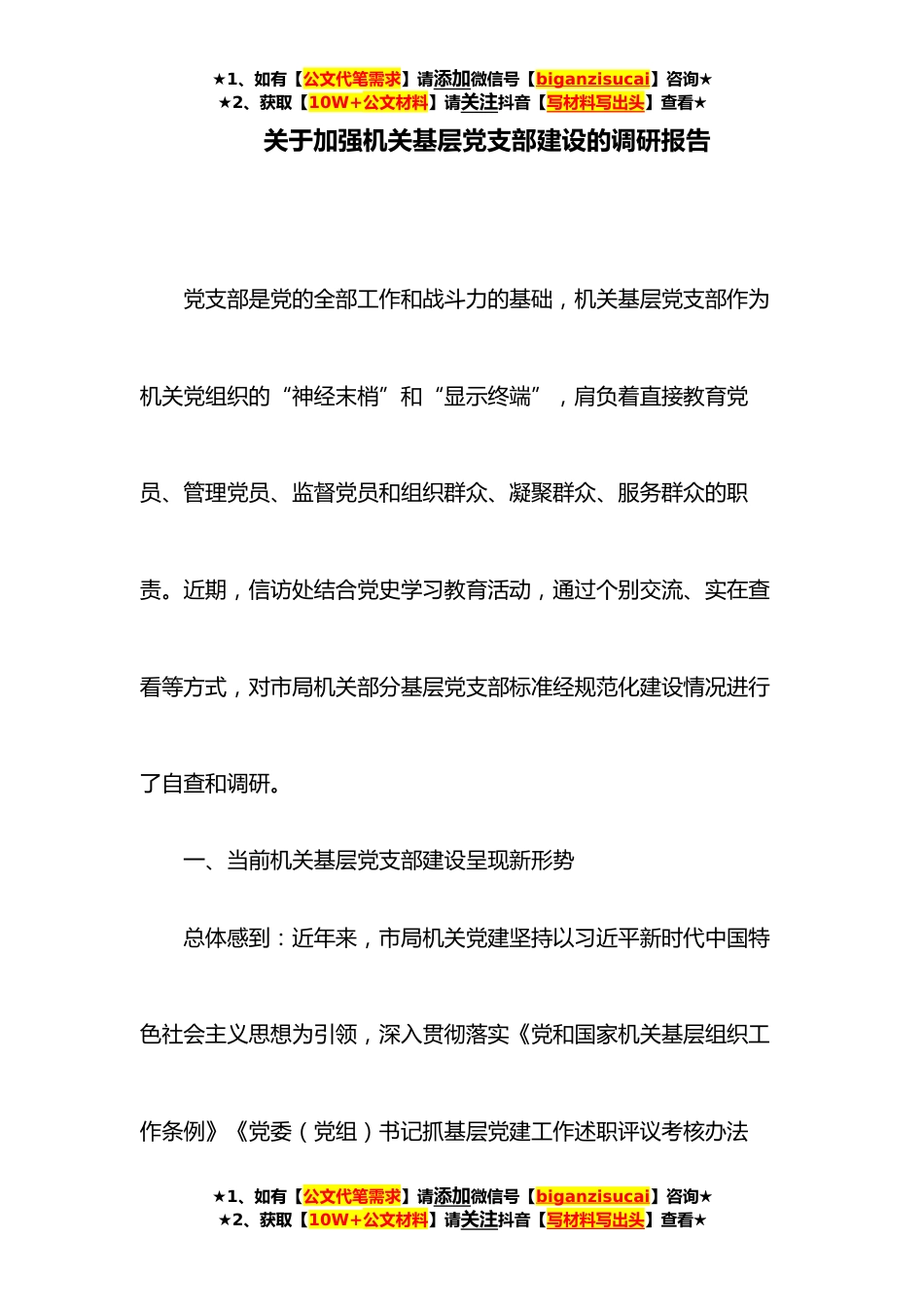 ★1、如有【公文代笔需求】请添加微信号【biganzisucai】咨询★★2、获取【10W+公文材料】请关注抖音【写材料写出头】查看★关于加强机关基层党支部建设的调研报告党支部是党的全部工作和战斗力的基础,机关基层党支部作为机关党组织的“神经末梢”和“显示终端”,肩负着直接教育党员、管理党员、监督党员和组织群众、凝聚群众、服务群众的职责。近期,信访处结合党史学习教育活动,通过个别交流、实在查看等方式,对市局机关部分基层党支部标准经规范化建设情况进行了自查和调研。一、当前机关基层党支部建设呈现新形势总体感到:近年来,市局机关党建坚持以习近平新时代中国特色社会主义思想为引领,深入贯彻落实《党和国家机关基层组织工作条例》《党委(党组)书记抓基层党建工作述职评议考核办法★1、如有【...