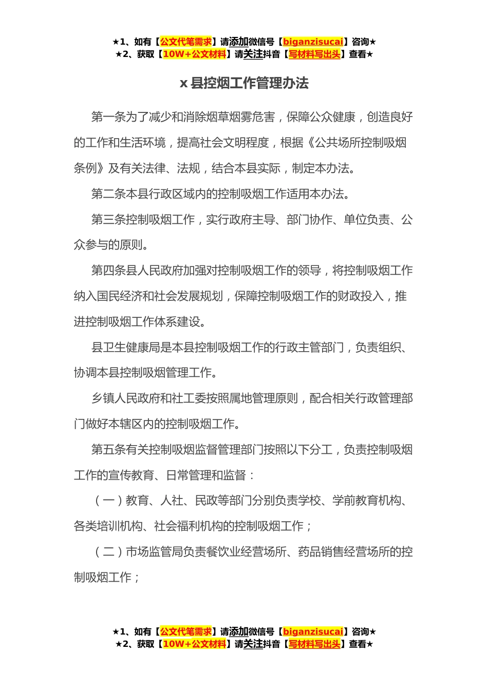 ★1、如有【公文代笔需求】请添加微信号【biganzisucai】咨询★★2、获取【10W+公文材料】请关注抖音【写材料写出头】查看★x县控烟工作管理办法第一条为了减少和消除烟草烟雾危害,保障公众健康,创造良好的工作和生活环境,提高社会文明程度,根据《公共场所控制吸烟条例》及有关法律、法规,结合本县实际,制定本办法。第二条本县行政区域内的控制吸烟工作适用本办法。第三条控制吸烟工作,实行政府主导、部门协作、单位负责、公众参与的原则。第四条县人民政府加强对控制吸烟工作的领导,将控制吸烟工作纳入国民经济和社会发展规划,保障控制吸烟工作的财政投入,推进控制吸烟工作体系建设。县卫生健康局是本县控制吸烟工作的行政主管部门,负责组织、协调本县控制吸烟管理工作。乡镇人民政府和社工委按照属地...