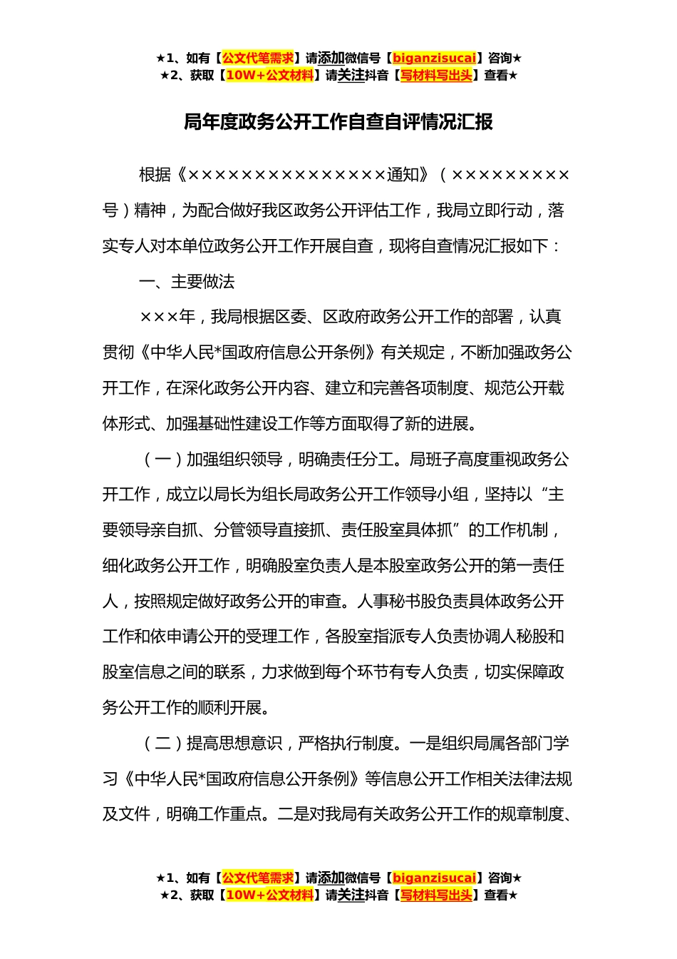 ★1、如有【公文代笔需求】请添加微信号【biganzisucai】咨询★★2、获取【10W+公文材料】请关注抖音【写材料写出头】查看★局年度政务公开工作自查自评情况汇报根据《×××××××××××××××通知》(×××××××××号)精神,为配合做好我区政务公开评估工作,我局立即行动,落实专人对本单位政务公开工作开展自查,现将自查情况汇报如下:一、主要做法×××年,我局根据区委、区政府政务公开工作的部署,认真贯彻《中华人民*国政府信息公开条例》有关规定,不断加强政务公开工作,在深化政务公开内容、建立和完善各项制度、规范公开载体形式、加强基础性建设工作等方面取得了新的进展。(一)加强组织领导,明确责任分工。局班子高度重视政务公开工作,成立以局长为组长局政务公开工作领导小组,坚...