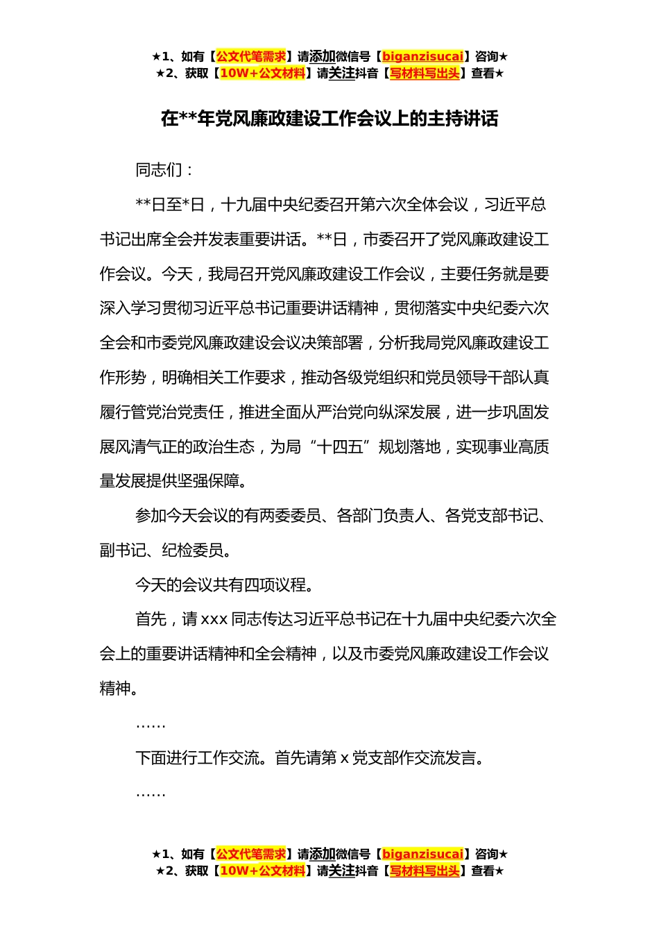 ★1、如有【公文代笔需求】请添加微信号【biganzisucai】咨询★★2、获取【10W+公文材料】请关注抖音【写材料写出头】查看★在**年党风廉政建设工作会议上的主持讲话同志们:**日至*日,十九届中央纪委召开第六次全体会议,习近平总书记出席全会并发表重要讲话。**日,市委召开了党风廉政建设工作会议。今天,我局召开党风廉政建设工作会议,主要任务就是要深入学习贯彻习近平总书记重要讲话精神,贯彻落实中央纪委六次全会和市委党风廉政建设会议决策部署,分析我局党风廉政建设工作形势,明确相关工作要求,推动各级党组织和党员领导干部认真履行管党治党责任,推进全面从严治党向纵深发展,进一步巩固发展风清气正的政治生态,为局“十四五”规划落地,实现事业高质量发展提供坚强保障。参加今天会议的有两委委...