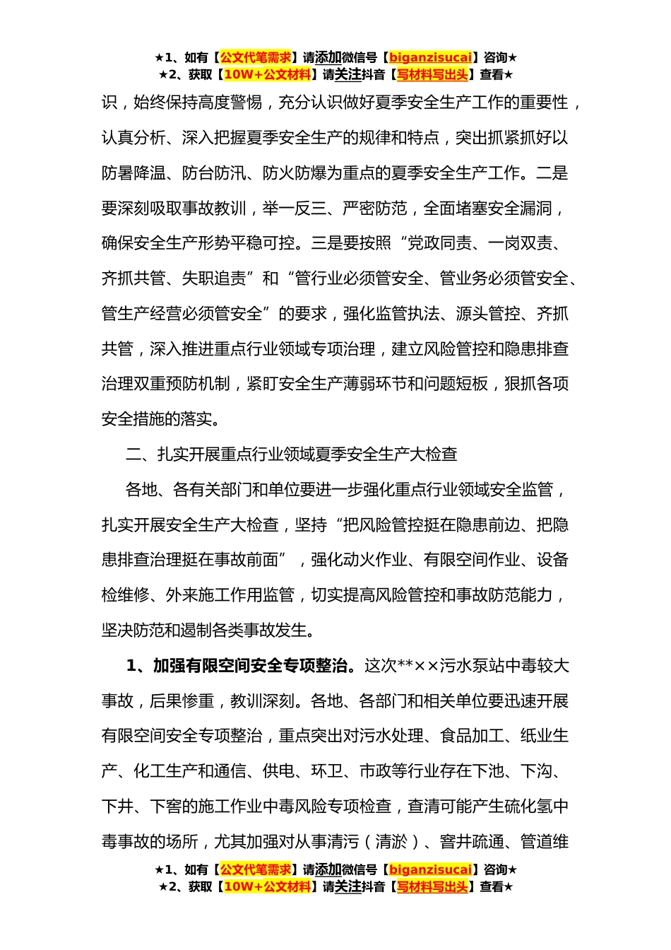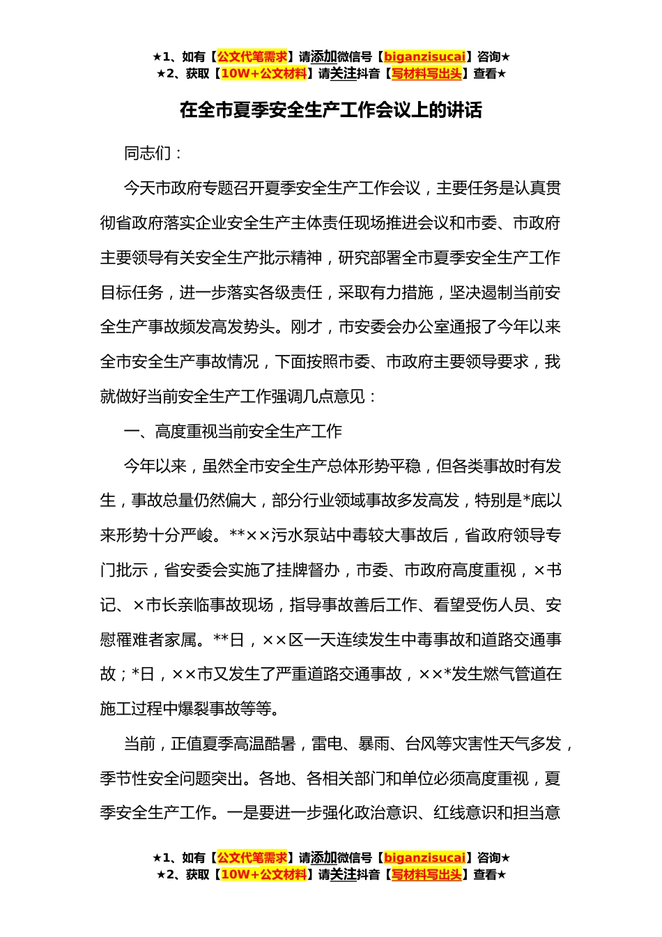 ★1、如有【公文代笔需求】请添加微信号【biganzisucai】咨询★★2、获取【10W+公文材料】请关注抖音【写材料写出头】查看★在全市夏季安全生产工作会议上的讲话同志们:今天市政府专题召开夏季安全生产工作会议,主要任务是认真贯彻省政府落实企业安全生产主体责任现场推进会议和市委、市政府主要领导有关安全生产批示精神,研究部署全市夏季安全生产工作目标任务,进一步落实各级责任,采取有力措施,坚决遏制当前安全生产事故频发高发势头。刚才,市安委会办公室通报了今年以来全市安全生产事故情况,下面按照市委、市政府主要领导要求,我就做好当前安全生产工作强调几点意见:一、高度重视当前安全生产工作今年以来,虽然全市安全生产总体形势平稳,但各类事故时有发生,事故总量仍然偏大,部分行业领域事故...