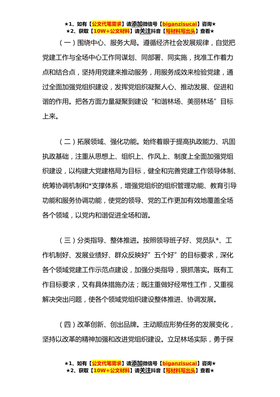 ★1、如有【公文代笔需求】请添加微信号【biganzisucai】咨询★★2、获取【10W+公文材料】请关注抖音【写材料写出头】查看★党建工作三年规划为认真贯彻落实习近平总书记重要讲话和党的十九大精神,以改革创新精神全面推进党的建设新的伟大工程,把基层党组织建设成为贯彻党的十九大精神,构建“和谐林场、美丽林场”的组织者、推动者和实践者,不断增强基层党组织的疑聚力、战斗力和影响力。现结合我场实际,制定**—**年查班河林场党组织建设规划。一、指导思想以习近平新时代中国特色社会主义思想为指导,以全面贯彻落实党的十九大和十九届历次全会精神为统领,牢固树立“四个意识”,做到“两个维护”,紧紧围绕加快我场社会秩序稳定、经济快速发展,坚持党要管党、从严治党的方针,以改革创新的精神,一手抓...