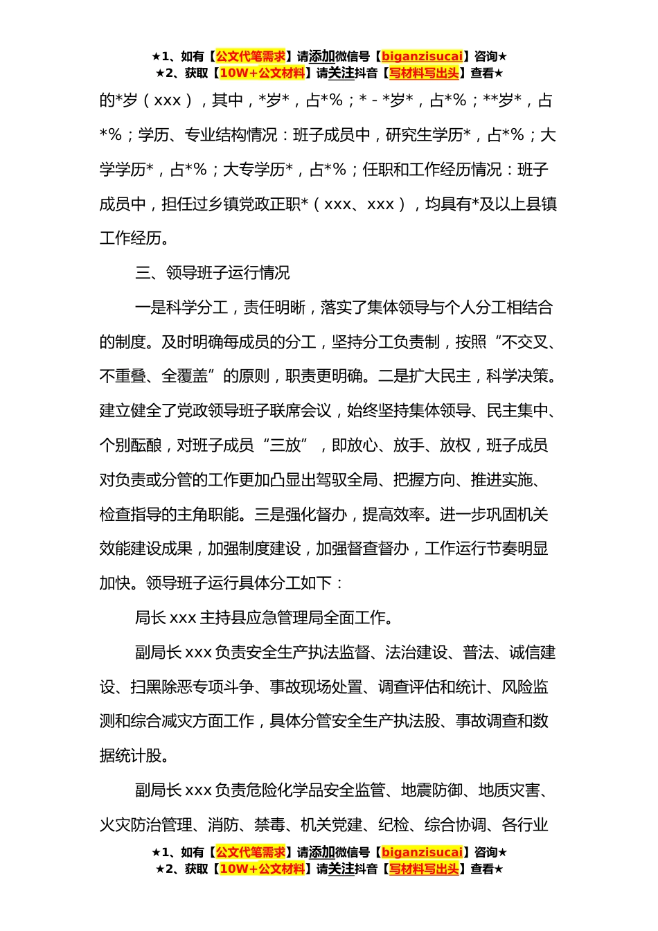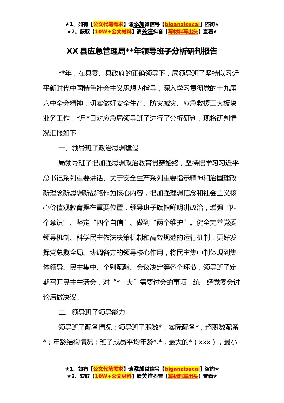 ★1、如有【公文代笔需求】请添加微信号【biganzisucai】咨询★★2、获取【10W+公文材料】请关注抖音【写材料写出头】查看★XX县应急管理局**年领导班子分析研判报告**年,在县委、县政府的正确领导下,局领导班子坚持以习近平新时代中国特色社会主义思想为指导,深入学习贯彻党的十九届六中全会精神,切实做好安全生产、防灾减灾、应急救援三大板块业务工作,*月*日对应急局领导班子进行了分析研判,现将研判情况汇报如下:一、领导班子政治思想建设局领导班子把加强思想政治教育贯穿始终,坚持把学习习近平总书记系列重要讲话、关于安全生产系列重要指示精神和治国理政新理念新思想新战略作为核心内容,把加强理想信念和社会主义核心价值观教育摆在重要位置,领导班子旗帜鲜明讲政治,增强“四个意识”、坚定“...