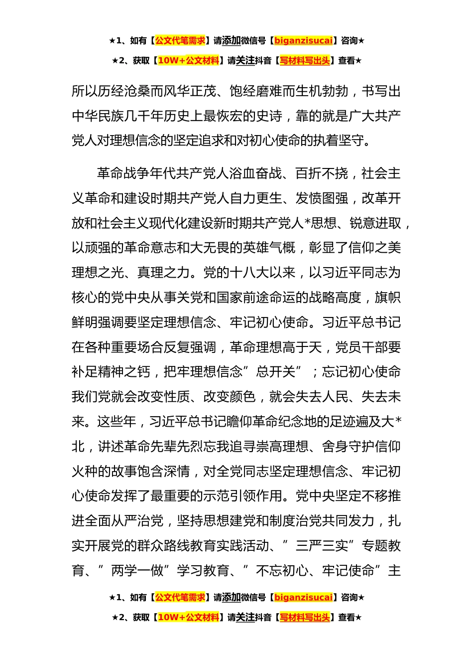 ★1、如有【公文代笔需求】请添加微信号【biganzisucai】咨询★★2、获取【10W+公文材料】请关注抖音【写材料写出头】查看★党课:擦亮政治底色坚定政治信仰党的十九届六中全会通过的《中共中央关于党的百年奋斗重大成就和历史经验的决议》系统总结党的百年奋斗重大成就和历史经验,强调全党要牢记中国共产党是什么要干什么这个根本问题,把握历史发展大势,坚定理想信念,牢记初心使命;要以咬定*不放松的执着奋力实现既定目标,以行百里者半九十的清醒不懈推进中华民族伟大*。落实好全会要求,要充分认识理想信念和初心使命是百年来激励中国共产党人不懈奋斗的根本动力,深刻把握理想信念和初心使命的时代要求,在坚定理想信念、牢记初心使命上持续努力,不断创造无愧于新时代的新业绩。一、理想信念和初心使命...