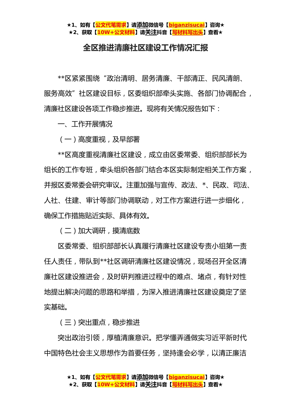 ★1、如有【公文代笔需求】请添加微信号【biganzisucai】咨询★★2、获取【10W+公文材料】请关注抖音【写材料写出头】查看★全区推进清廉社区建设工作情况汇报**区紧紧围绕“政治清明、居务清廉、干部清正、民风清朗、服务高效”社区建设目标,区委组织部牵头实施、各部门协调配合,清廉社区建设各项工作稳步推进。现将有关情况报告如下:一、工作开展情况(一)高度重视,及早部署**区高度重视清廉社区建设,成立由区委常委、组织部部长为组长的工作专班,牵头组织各部门结合本区实际制定相关工作方案,并报区委常委会研究审议。注重加强与宣传、政法、*、民政、司法、人社、住建、审计等部门协调联动,对工作方案进行进一步细化,确保工作措施贴近实际、具体有效。(二)加大调研,摸清底数区委常委、组织部部长...