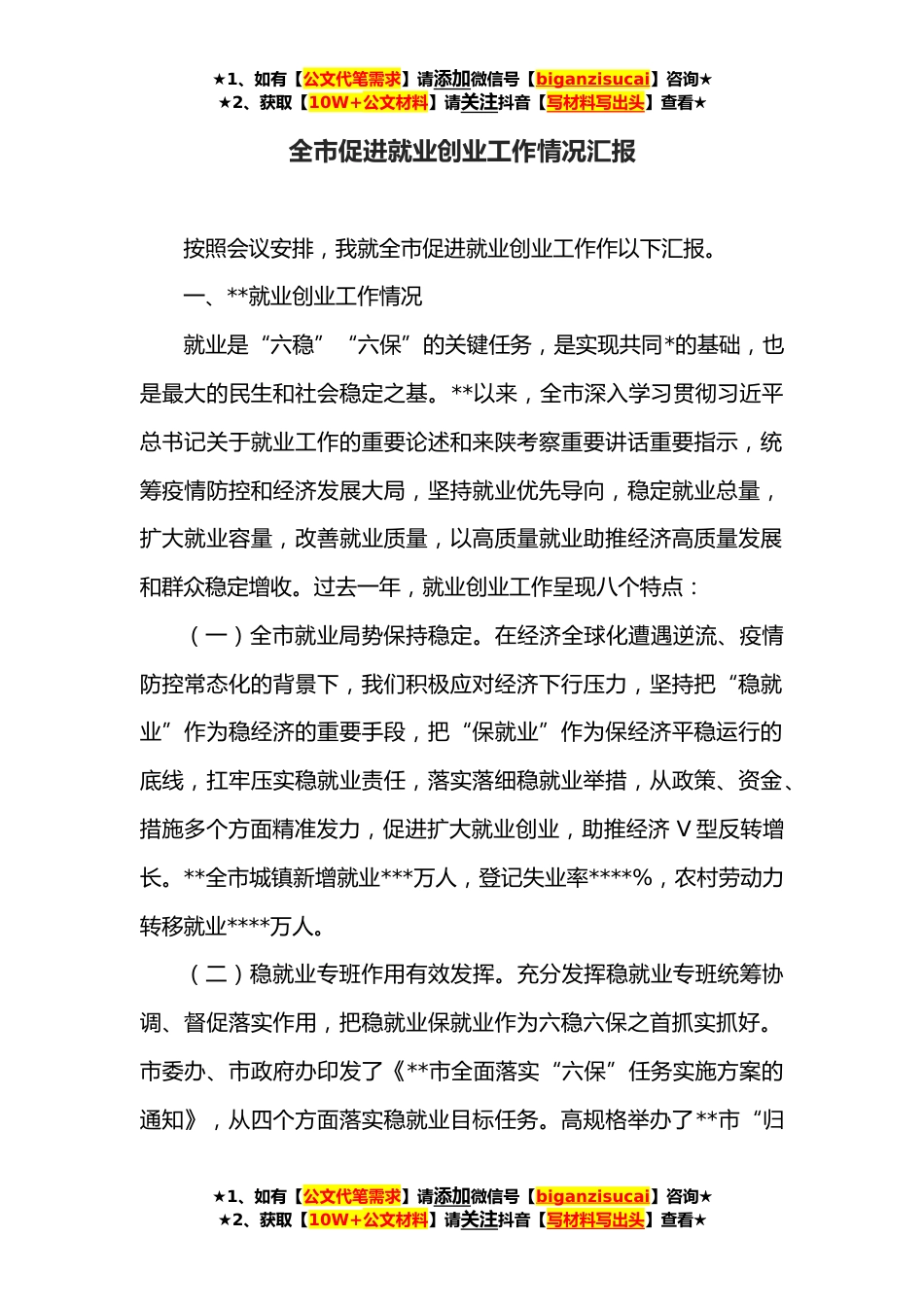 ★1、如有【公文代笔需求】请添加微信号【biganzisucai】咨询★★2、获取【10W+公文材料】请关注抖音【写材料写出头】查看★全市促进就业创业工作情况汇报按照会议安排,我就全市促进就业创业工作作以下汇报。一、**就业创业工作情况就业是“六稳”“六保”的关键任务,是实现共同*的基础,也是最大的民生和社会稳定之基。**以来,全市深入学习贯彻习近平总书记关于就业工作的重要论述和来陕考察重要讲话重要指示,统筹疫情防控和经济发展大局,坚持就业优先导向,稳定就业总量,扩大就业容量,改善就业质量,以高质量就业助推经济高质量发展和群众稳定增收。过去一年,就业创业工作呈现八个特点:(一)全市就业局势保持稳定。在经济全球化遭遇逆流、疫情防控常态化的背景下,我们积极应对经济下行压力,坚持把“...
