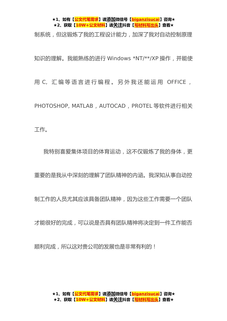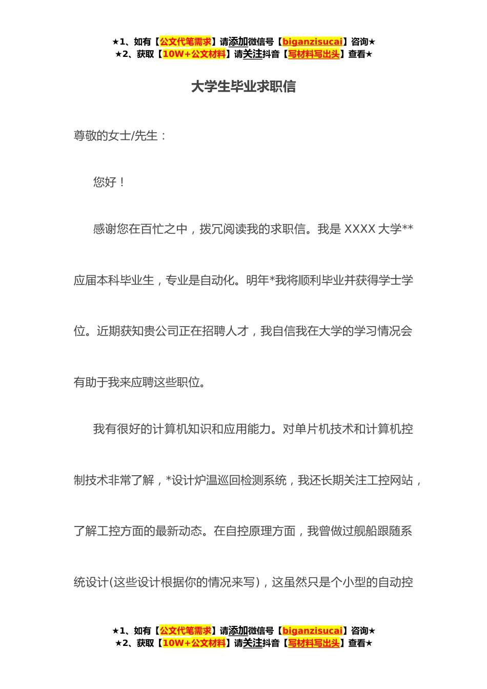 ★1、如有【公文代笔需求】请添加微信号【biganzisucai】咨询★★2、获取【10W+公文材料】请关注抖音【写材料写出头】查看★大学生毕业求职信尊敬的女士/先生:您好!感谢您在百忙之中,拨冗阅读我的求职信。我是XXXX大学**应届本科毕业生,专业是自动化。明年*我将顺利毕业并获得学士学位。近期获知贵公司正在招聘人才,我自信我在大学的学习情况会有助于我来应聘这些职位。我有很好的计算机知识和应用能力。对单片机技术和计算机控制技术非常了解,*设计炉温巡回检测系统,我还长期关注工控网站,了解工控方面的最新动态。在自控原理方面,我曾做过舰船跟随系统设计(这些设计根据你的情况来写),这虽然只是个小型的自动控★1、如有【公文代笔需求】请添加微信号【biganzisucai】咨询★★2、获取【10W+公文材料】...
