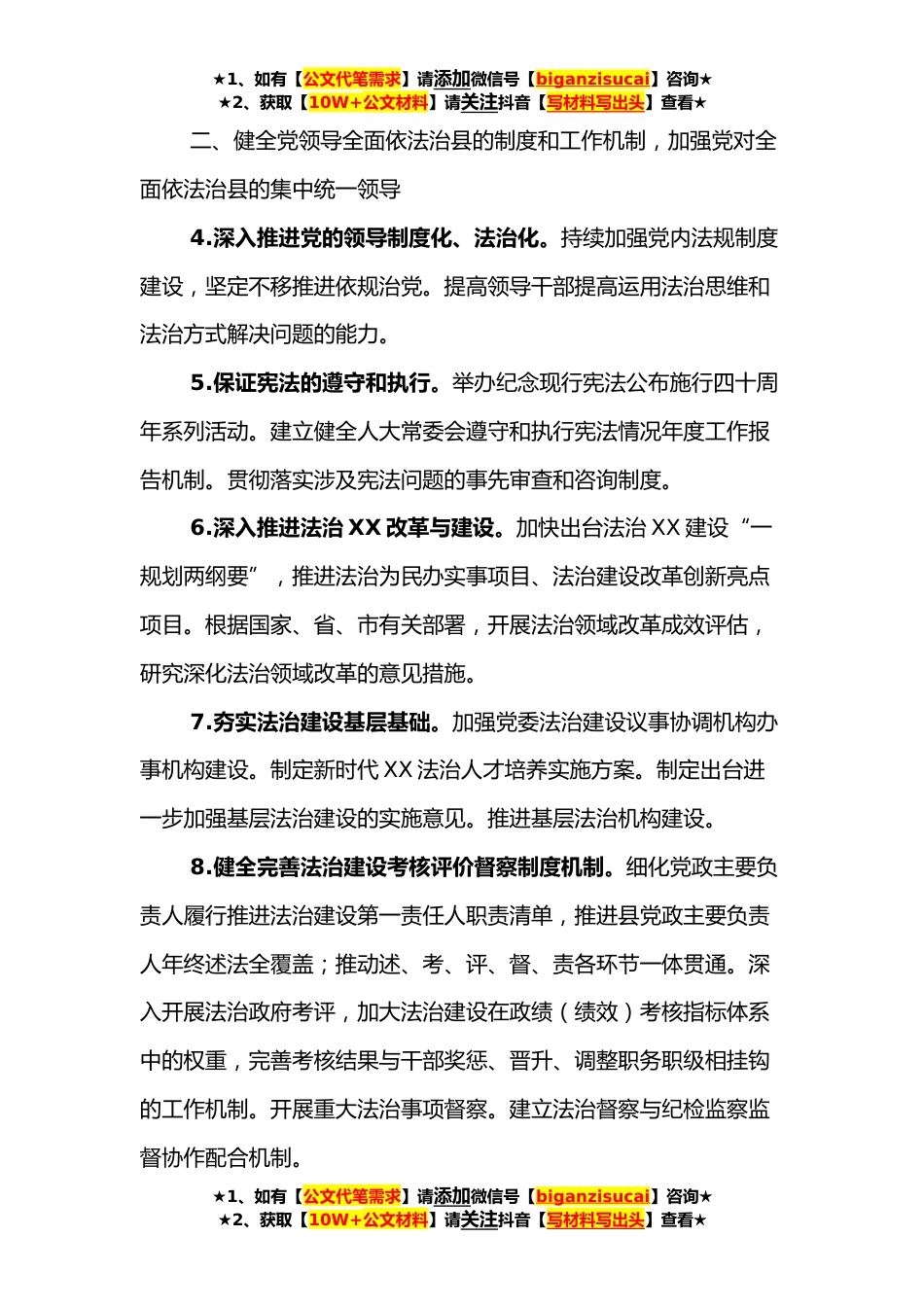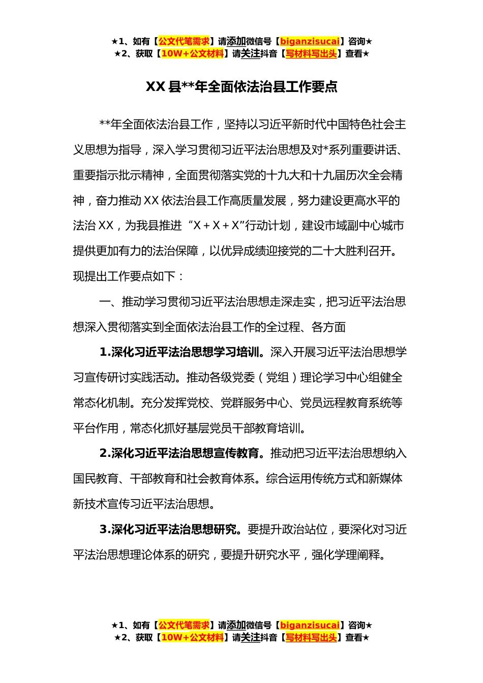 ★1、如有【公文代笔需求】请添加微信号【biganzisucai】咨询★★2、获取【10W+公文材料】请关注抖音【写材料写出头】查看★XX县**年全面依法治县工作要点**年全面依法治县工作,坚持以习近平新时代中国特色社会主义思想为指导,深入学习贯彻习近平法治思想及对*系列重要讲话、重要指示批示精神,全面贯彻落实党的十九大和十九届历次全会精神,奋力推动XX依法治县工作高质量发展,努力建设更高水平的法治XX,为我县推进“X+X+X”行动计划,建设市域副中心城市提供更加有力的法治保障,以优异成绩迎接党的二十大胜利召开。现提出工作要点如下:一、推动学习贯彻习近平法治思想走深走实,把习近平法治思想深入贯彻落实到全面依法治县工作的全过程、各方面1.深化习近平法治思想学习培训。深入开展习近平法治思想学...